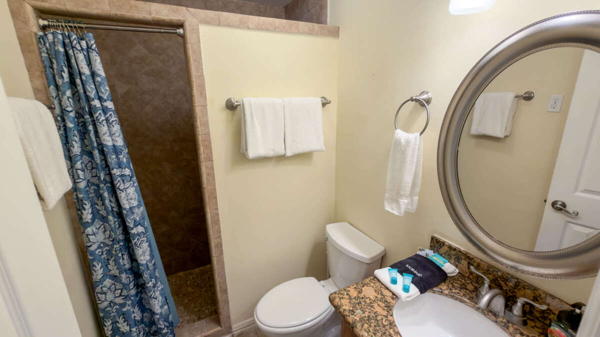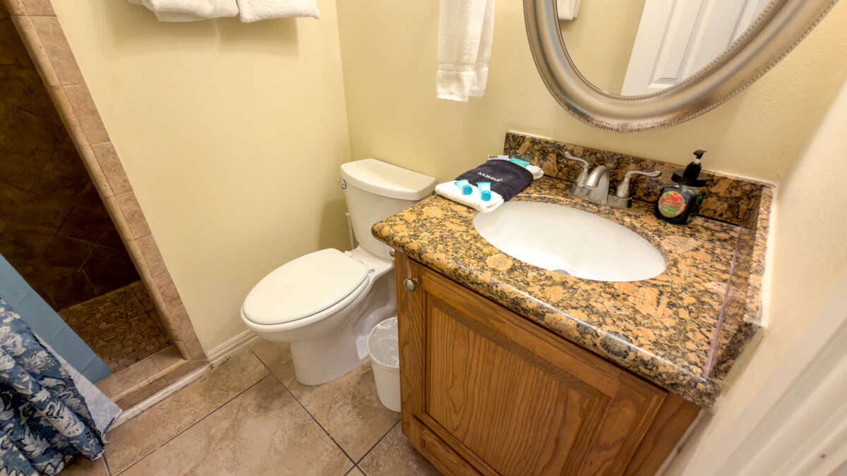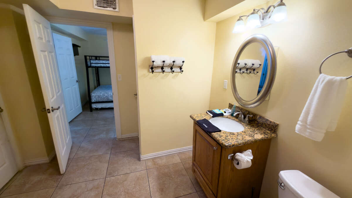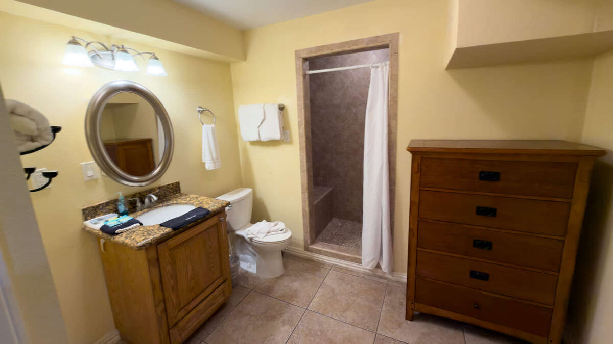 A full shared bathroom, with walk-in shower (no tubs) are on each floor as well. You'll find a secondary living room on the ground floor with a large comfortable sofa and chair surrounding an another flat screen TVs