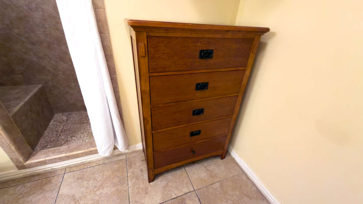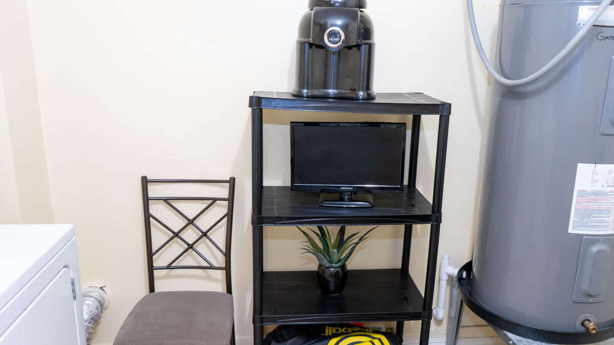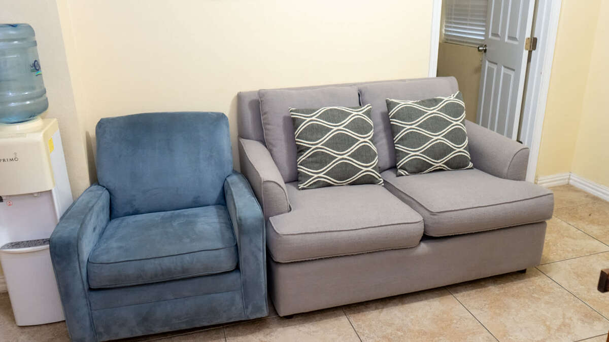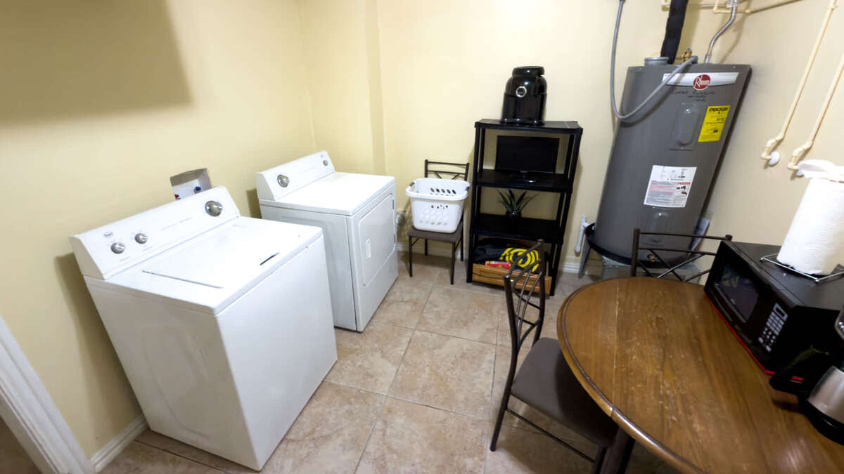 A full shared bathroom, with walk-in shower (no tubs) are on each floor as well. You'll find a secondary living room on the ground floor with a large comfortable sofa and chair surrounding an another flat screen TVs