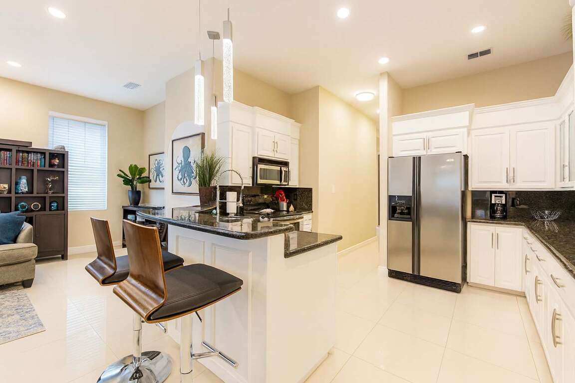 The kitchen is equipped with granite counter tops, stainless steel appliances, including dishwasher and refrigerator with ice maker and water dispenser, and is fully stocked with all kitchenware like pots, pans, dishes etc needed to make a tasty home-cooked meal while on vacation