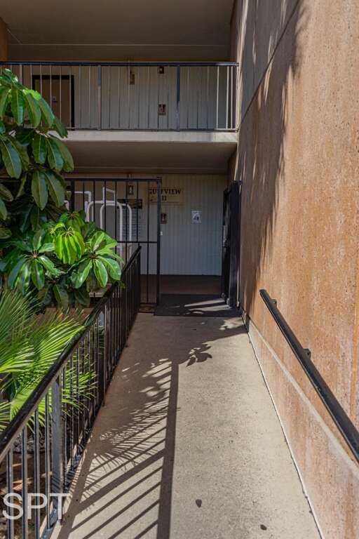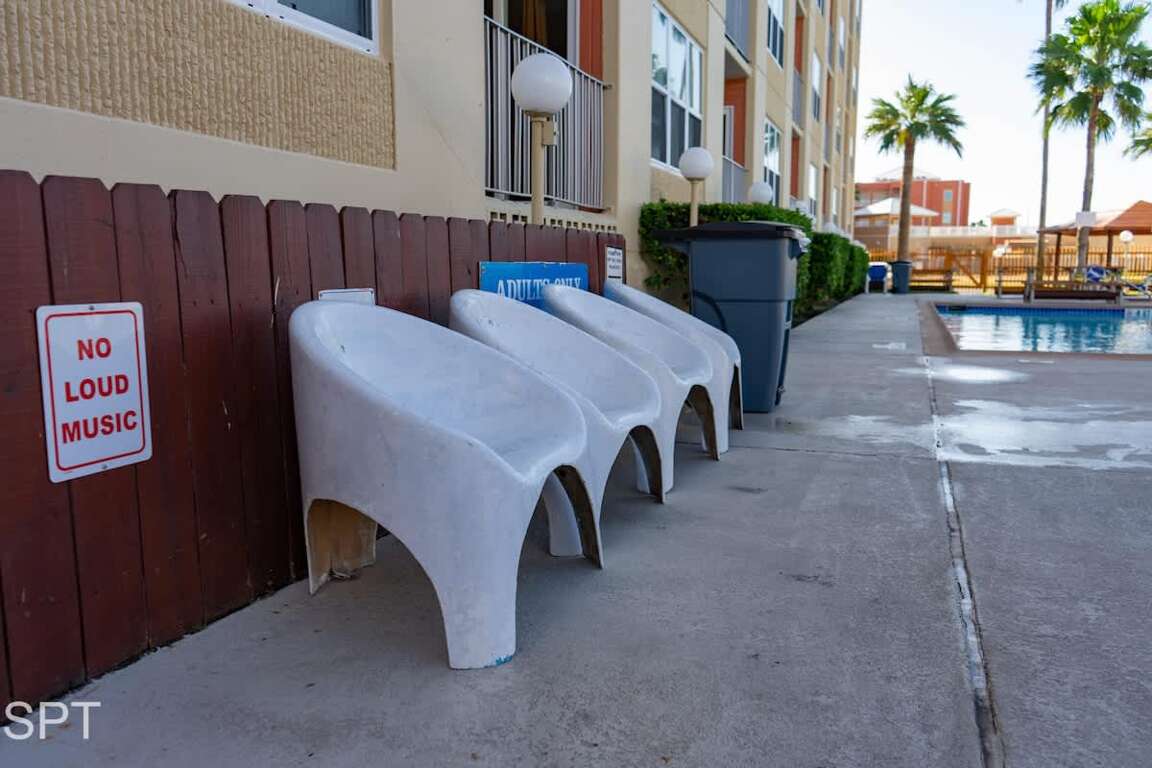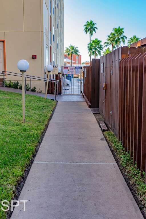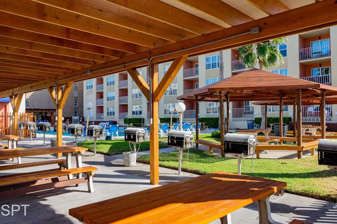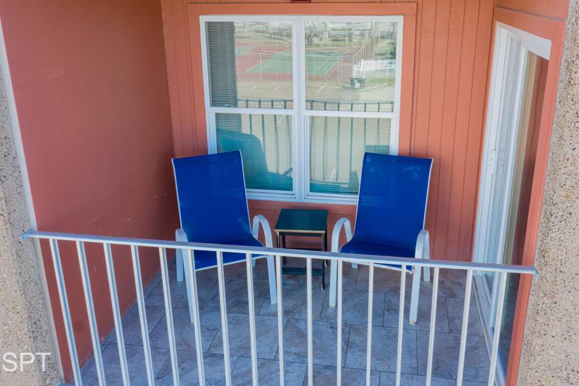 The condo has a private patio overlooking Sea Park SPI (waterpark) and parking lot.