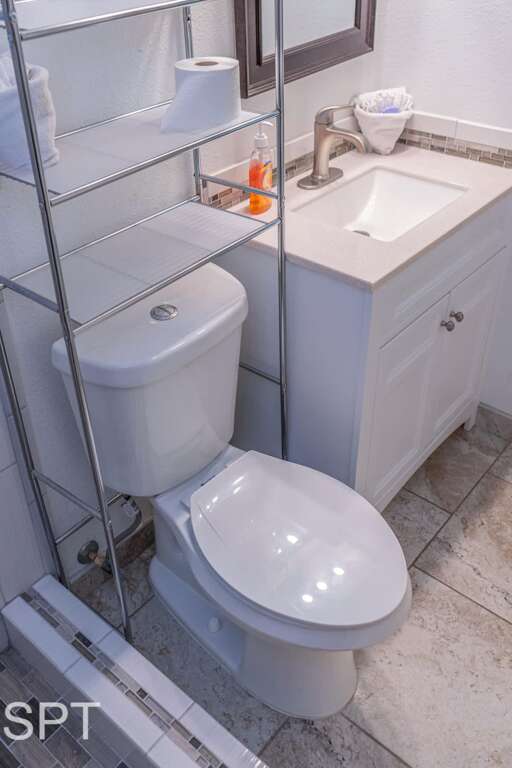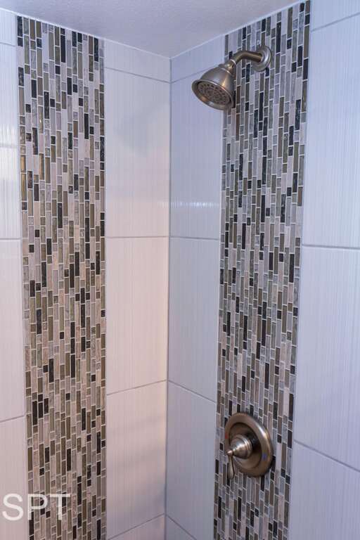 The interior is fresh and modern with all-tile flooring, white quartz counters, and a new walk-in tile shower.