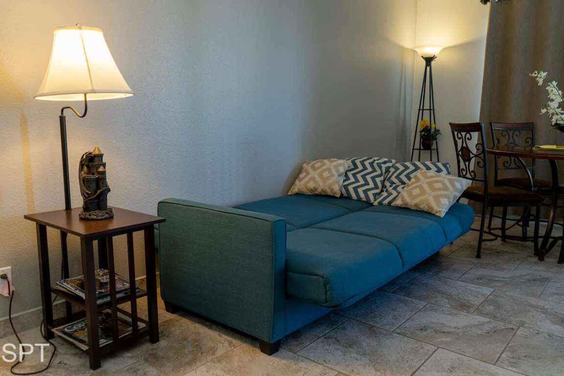 Recently remodeled with all-tile flooring, quartz counters, + walk-in shower. Smart TVs in the living room & bedroom. Newer beds + pull-out sleeper sofa. Up to 6 guests allowed