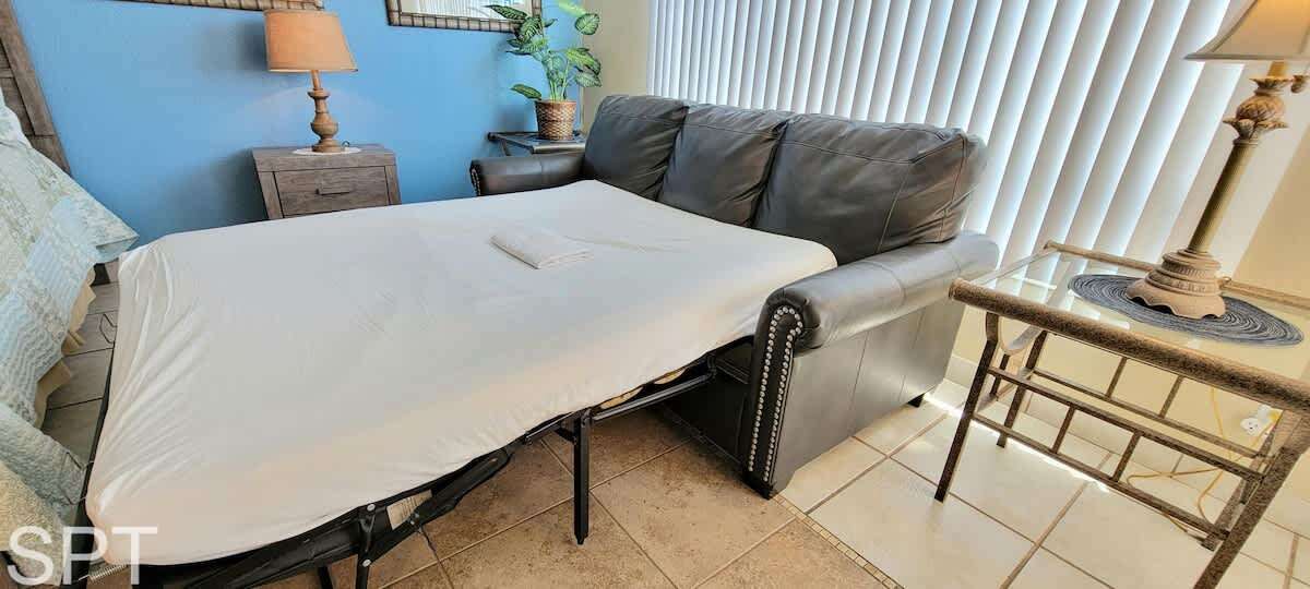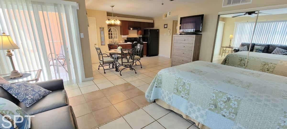 An efficiency condo means that the kitchen/dining flow right into the bedroom area - it is not separate. There is a nice queen bed for mom & dad, a pull out couch for the kiddos, and we do provide an extra airbed if you. have a grumpy teen coming along :) Max allowed is 5 people (yes a baby is a person!) as that is max building HOA allows - sorry. no exceptions.