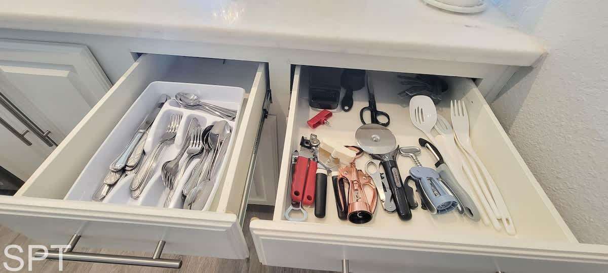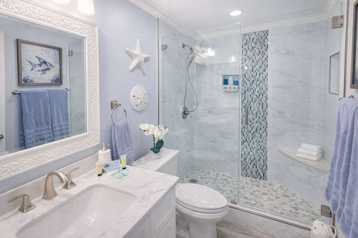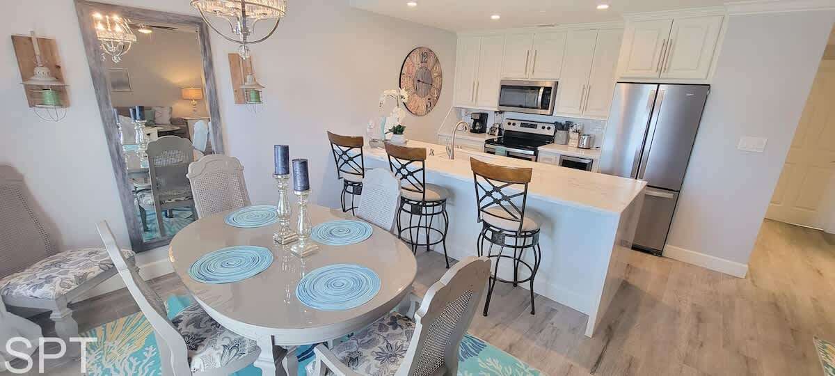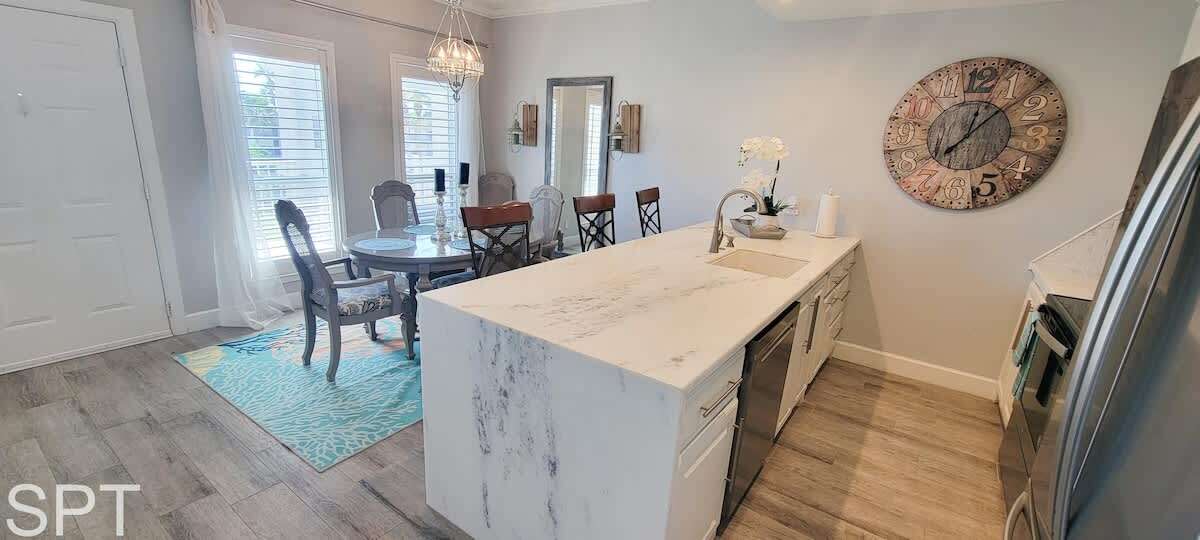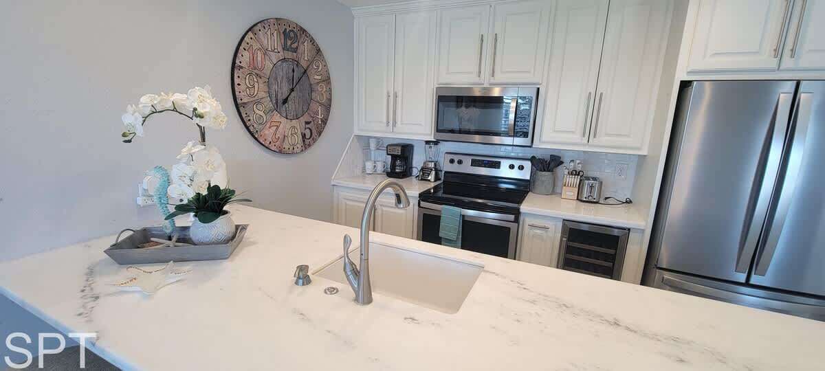 While not beachfront, from the front semi patio, you have a partial beachview to enjoy a sunset margarita and relax. The kitchen is equipped with all pots, pans, utensils etc to make meal prep easy for your family. The kitchen is true luxury with white quartz counters, new stainless appliances, and even a wine fridge. There is a dishwasher to make kitchen clean up easier too