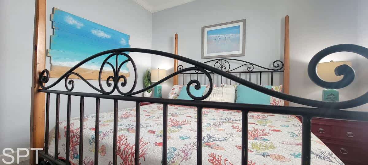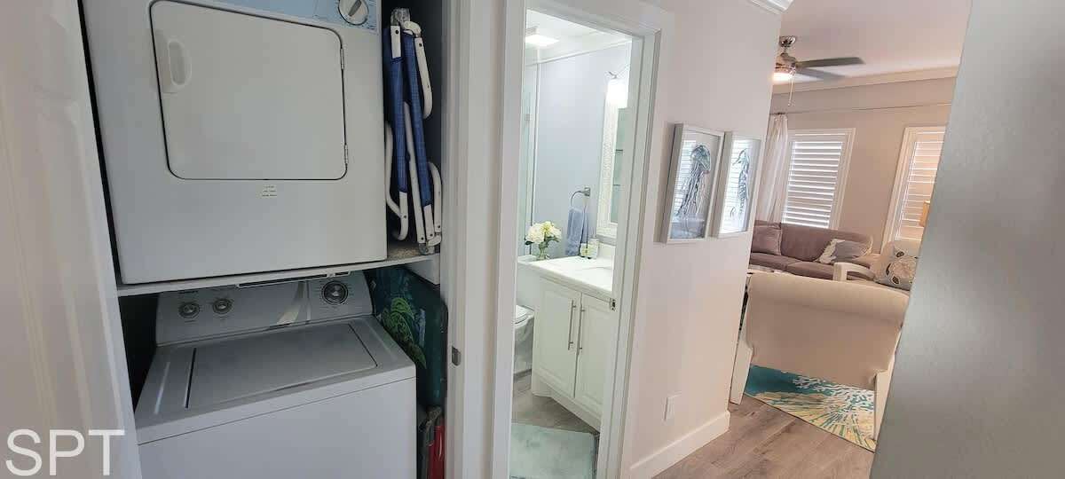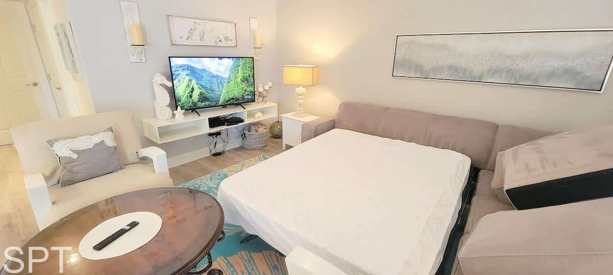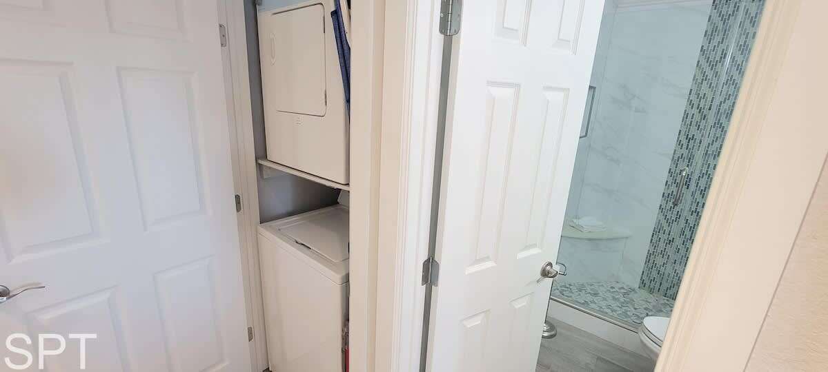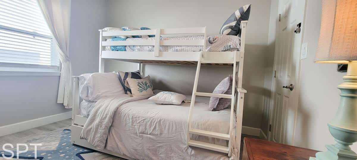 Complete open concept, the living room & dining area flows to the massive section couch & smart TV for movie night or just relaxing. The couch does feature a pull out sleeper sofa that is a full bed in size. Down the main hall, you will find a convenient stackable washer & dryer, 2 full bathrooms with new all tile walk in showers, impeccable decorations & a all tile floors. The spare bedroom has a unique twin over full adult sized bunk bed with a pull out trundle bed that is a single in size, making this room perfect for a kiddos bunkroom. The generous master bedroom has a king bed, en suite bathroom & wal mounted flat screen app ready to wind down after a long day at the beach