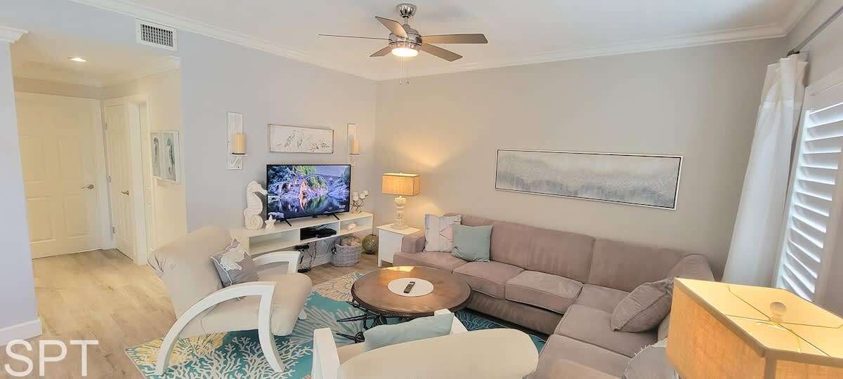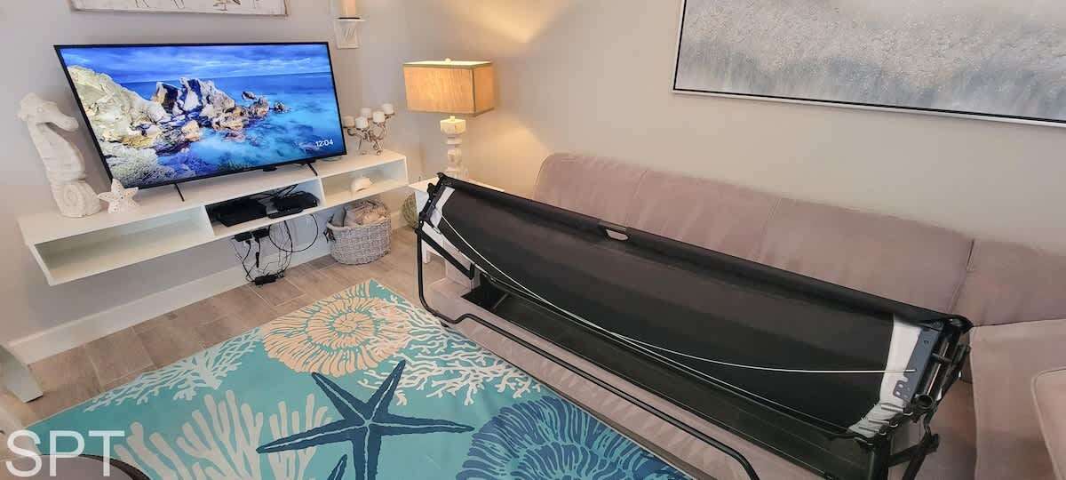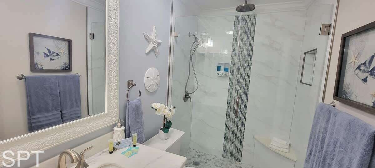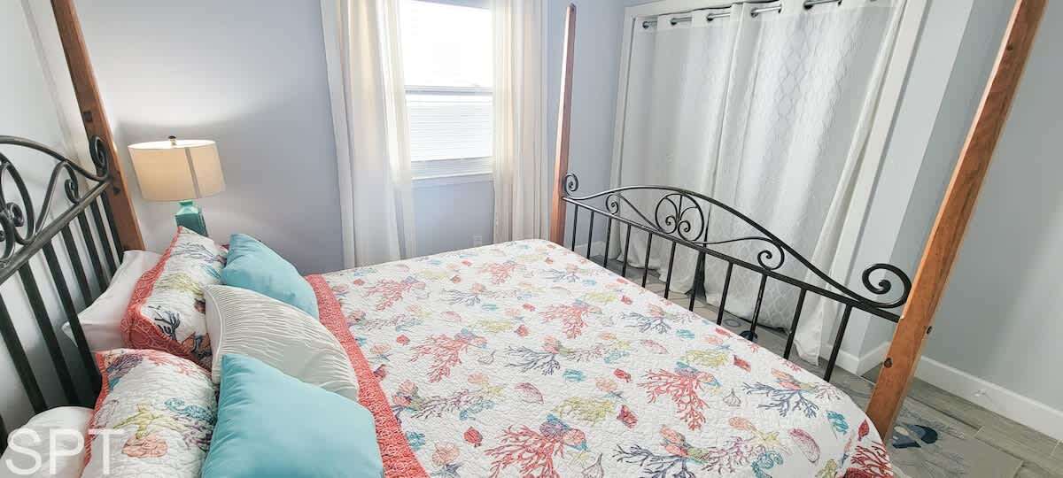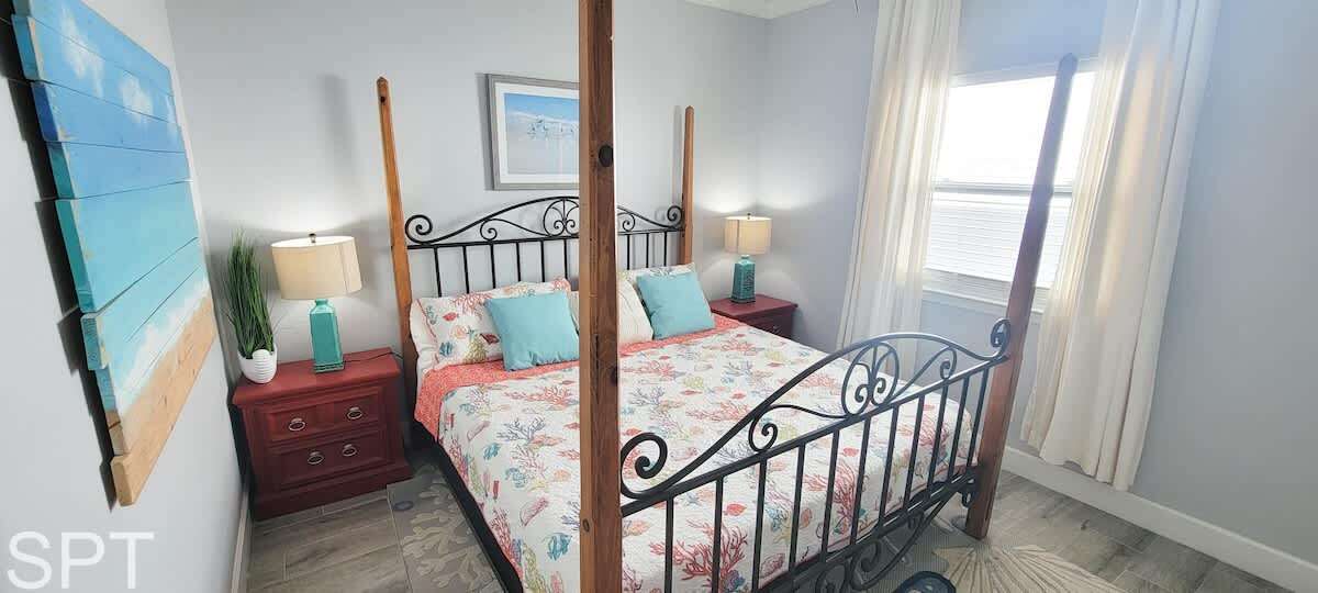 Complete open concept, the living room & dining area flows to the massive section couch & smart TV for movie night or just relaxing. The couch does feature a pull out sleeper sofa that is a full bed in size. Down the main hall, you will find a convenient stackable washer & dryer, 2 full bathrooms with new all tile walk in showers, impeccable decorations & a all tile floors. The spare bedroom has a unique twin over full adult sized bunk bed with a pull out trundle bed that is a single in size, making this room perfect for a kiddos bunkroom. The generous master bedroom has a king bed, en suite bathroom & wal mounted flat screen app ready to wind down after a long day at the beach