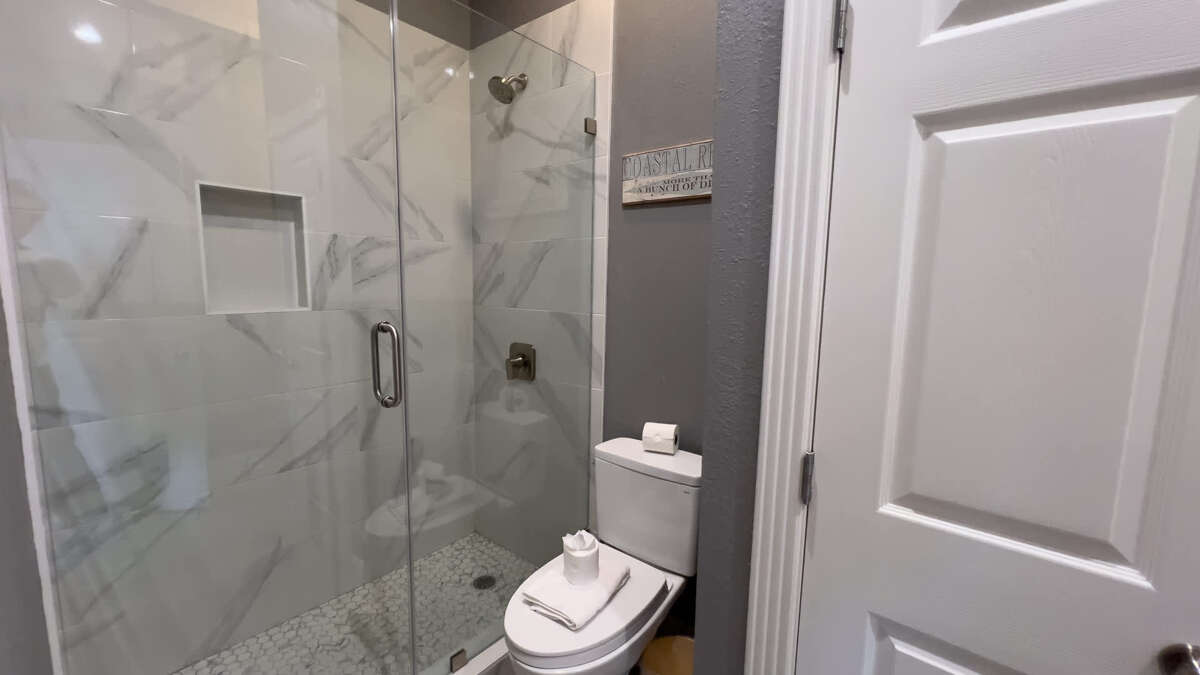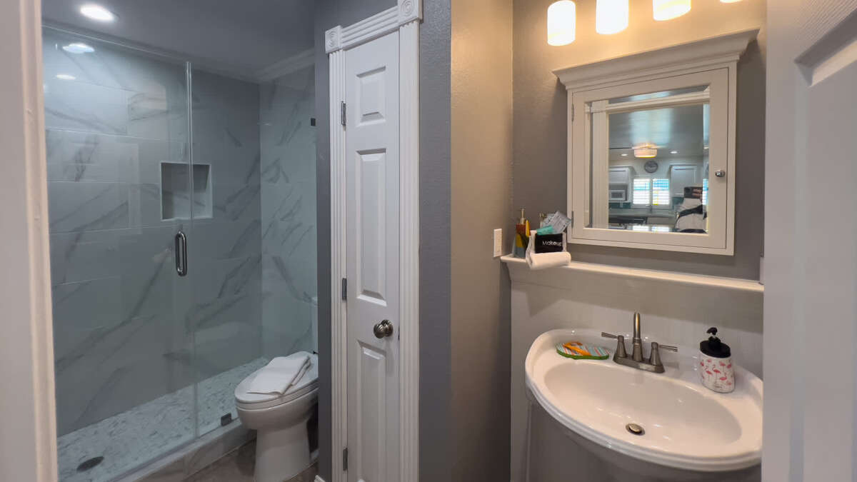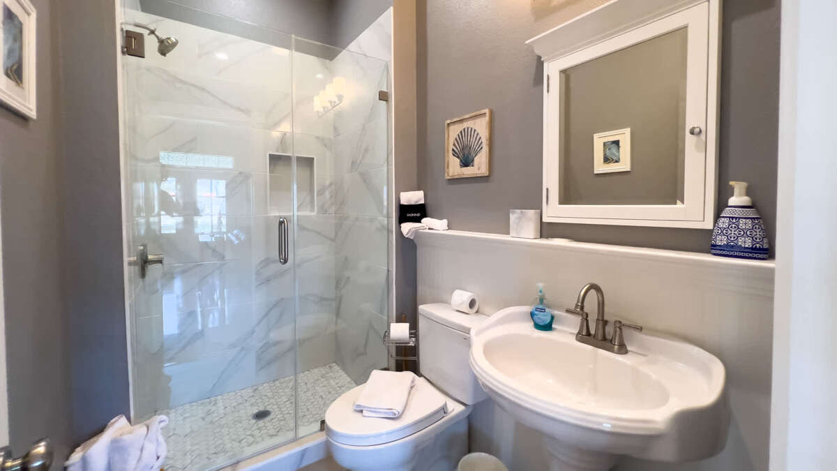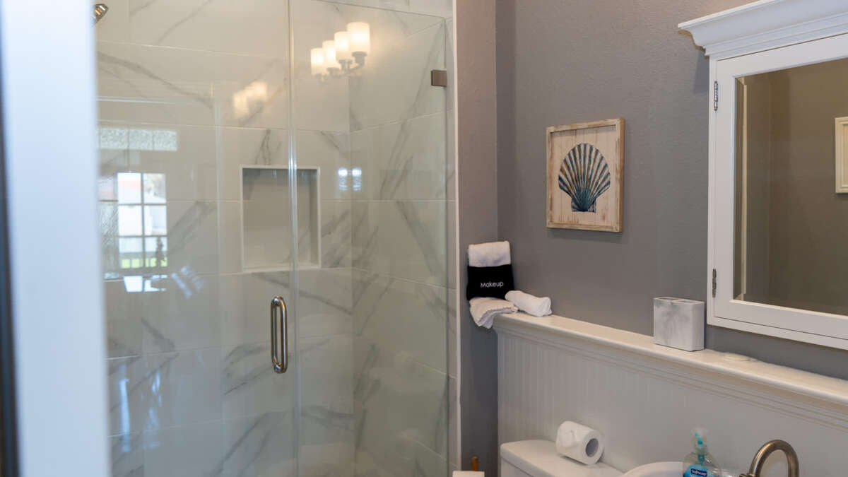 Bathroom 3 (full bath): 1st floor in hallway, each access from pool and bunk room