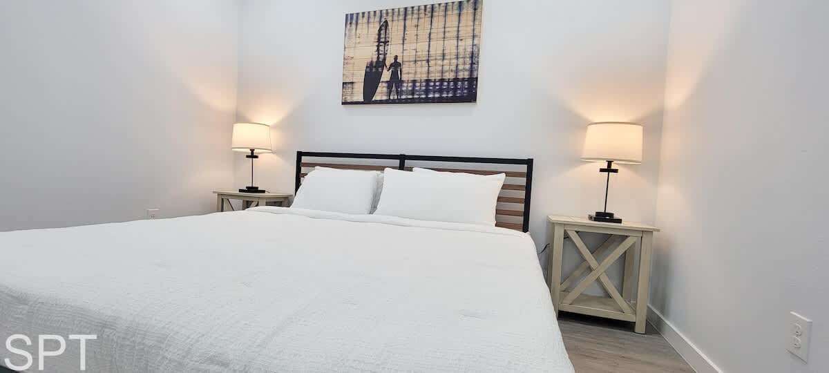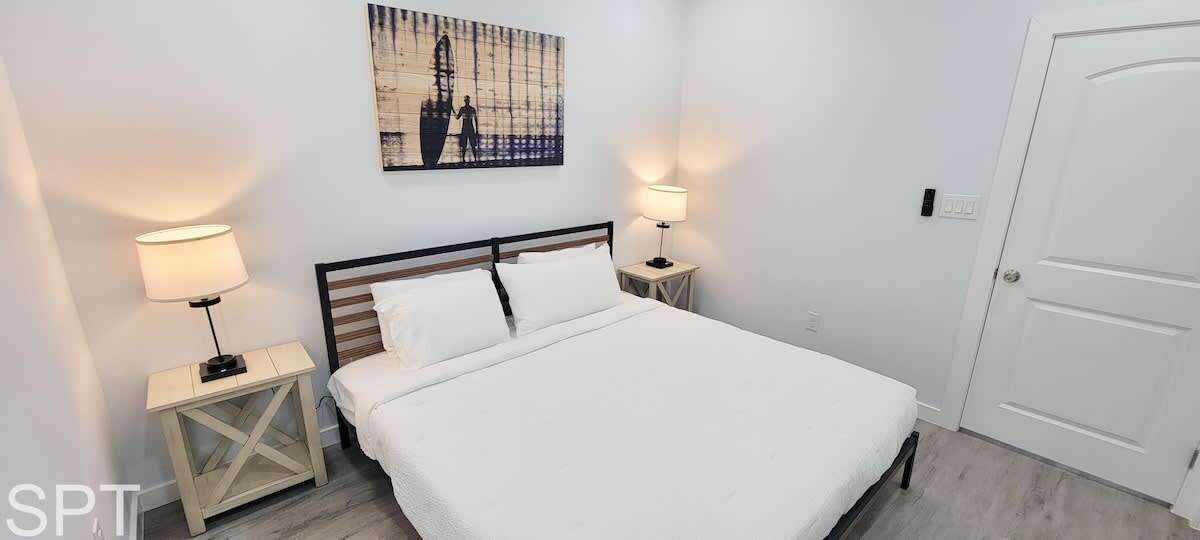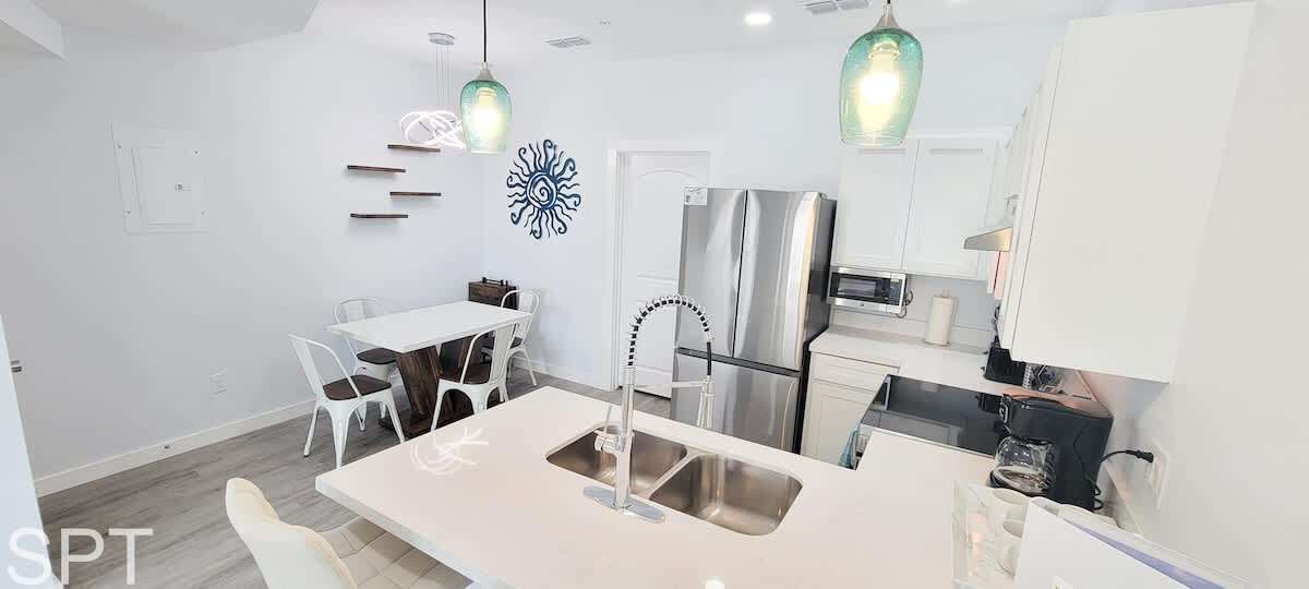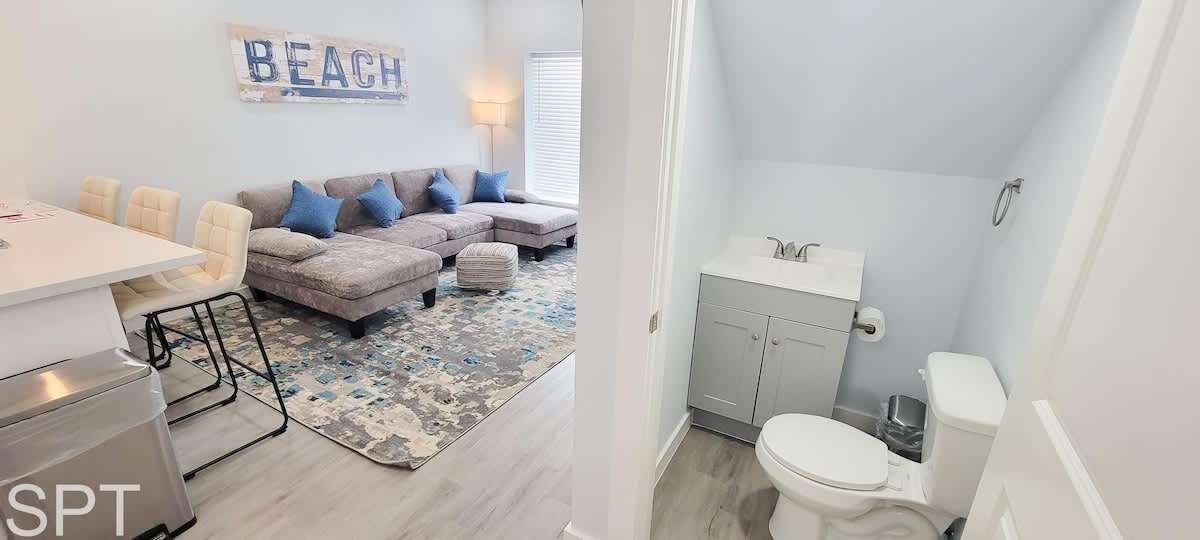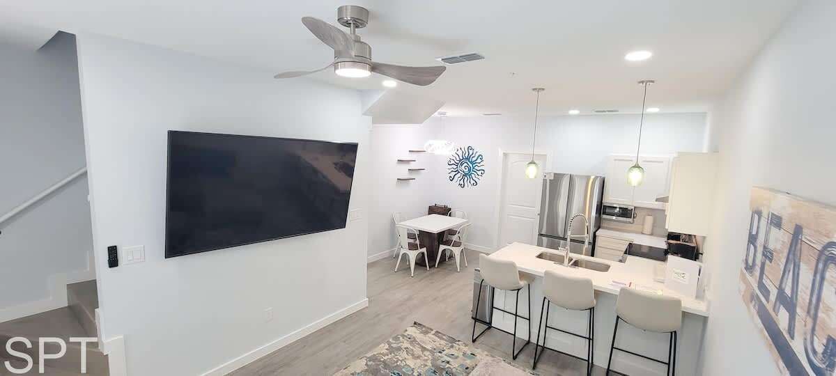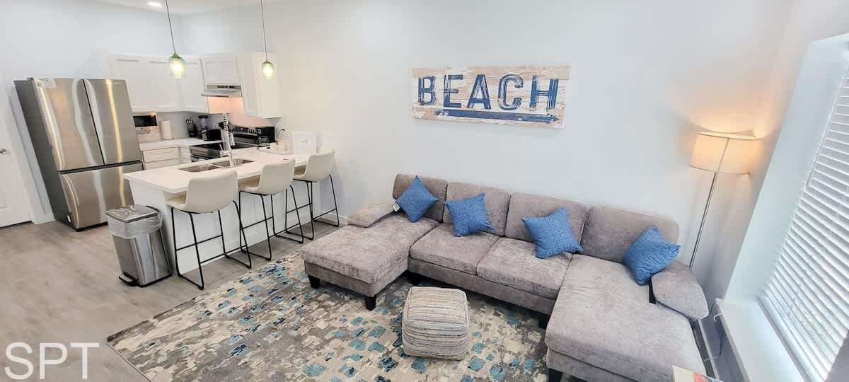 As there are just 4 brand all new townhomes here, you can expect white quartz counters, stainless appliances, as well a completely open concept kitchen & living room with massive 75” Smart TV & sectional couch to enjoy movies or a football game after a long day at the beach.