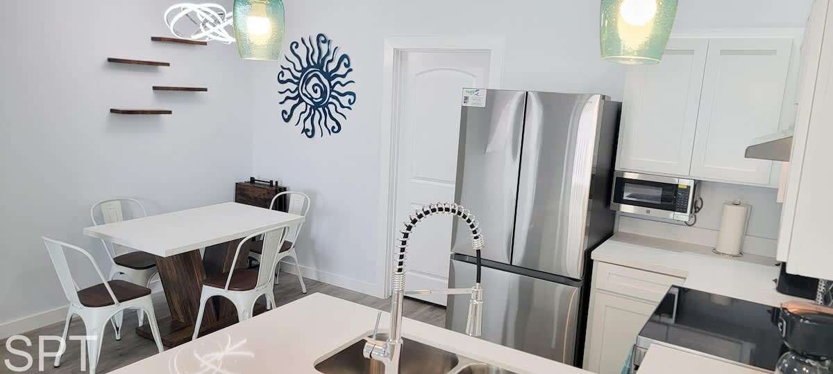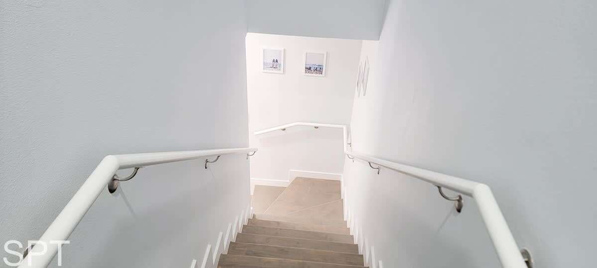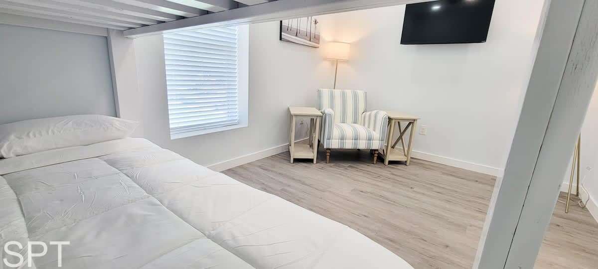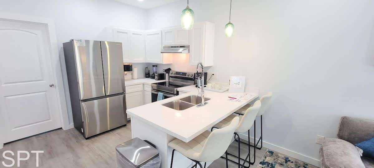 As there are just 4 brand all new townhomes here, you can expect white quartz counters, stainless appliances, as well a completely open concept kitchen & living room with massive 75” Smart TV & sectional couch to enjoy movies or a football game after a long day at the beach.