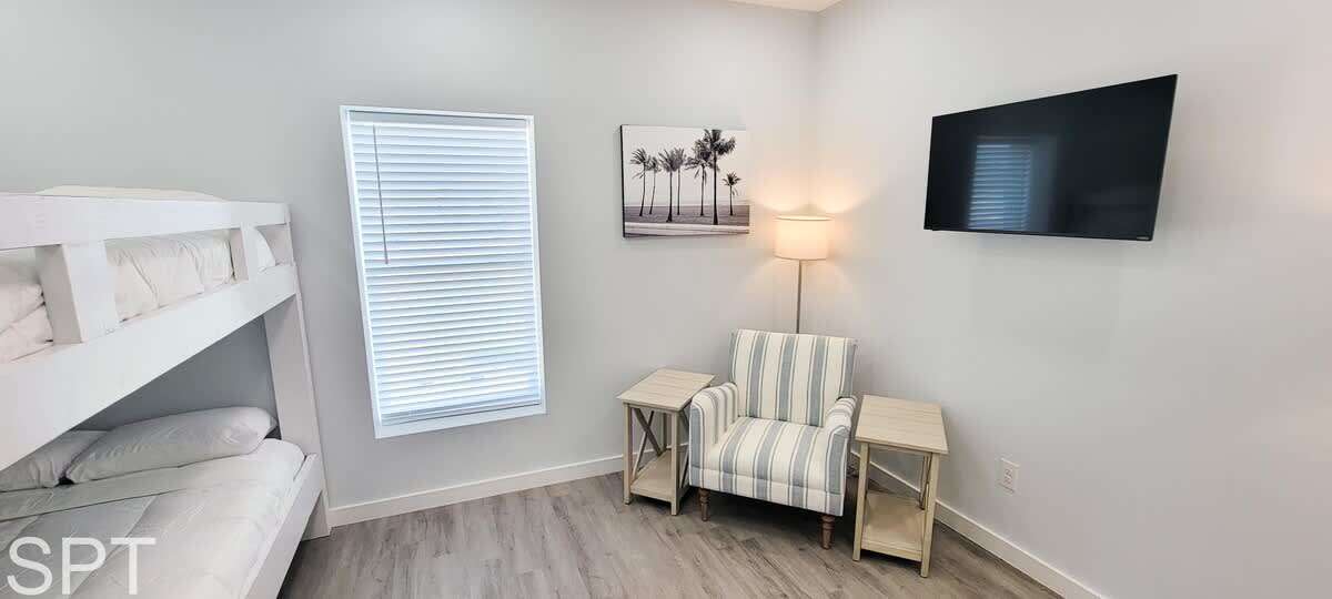 All furniture is brand new. There is also a smart TV in the master bedroom as well as upstairs in the kids bunkroom.