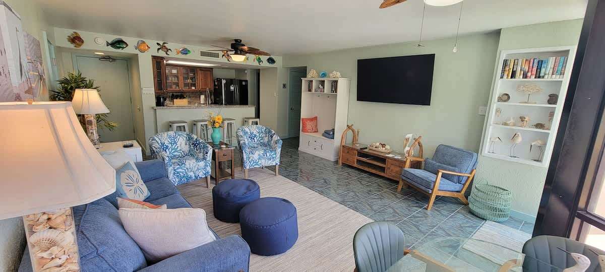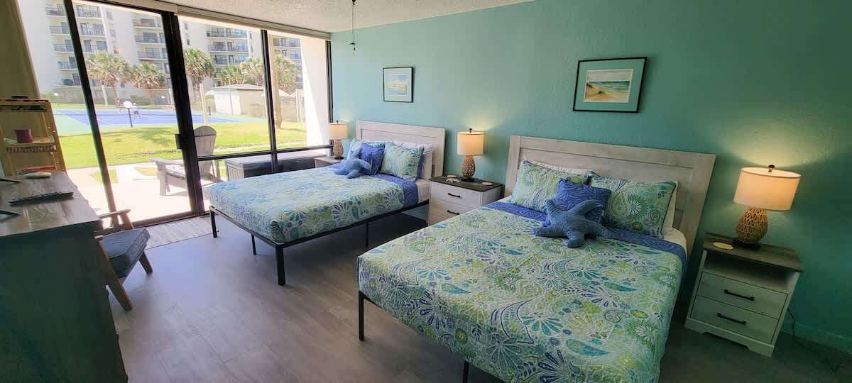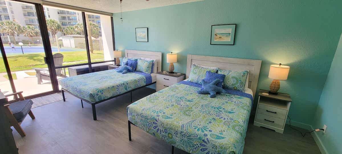 Off to the right of the main living space is the 2nd bedroom with 2 new queen beds and yet another full bathroom. There is a SMART flat screen TV to enjoy after the beach.