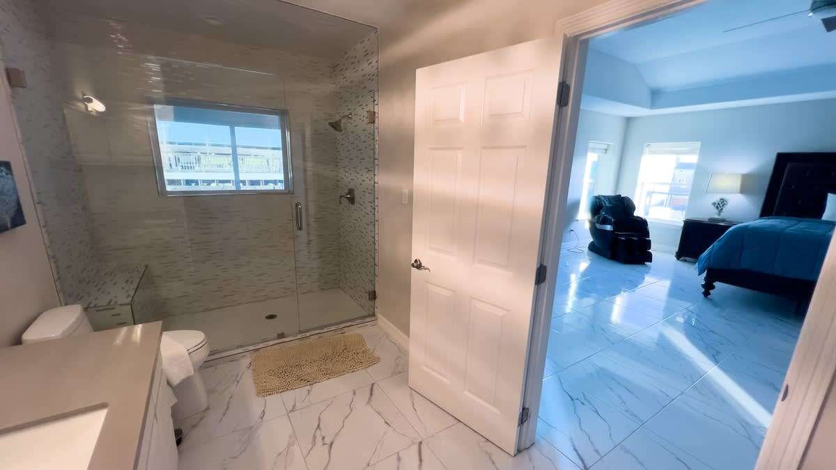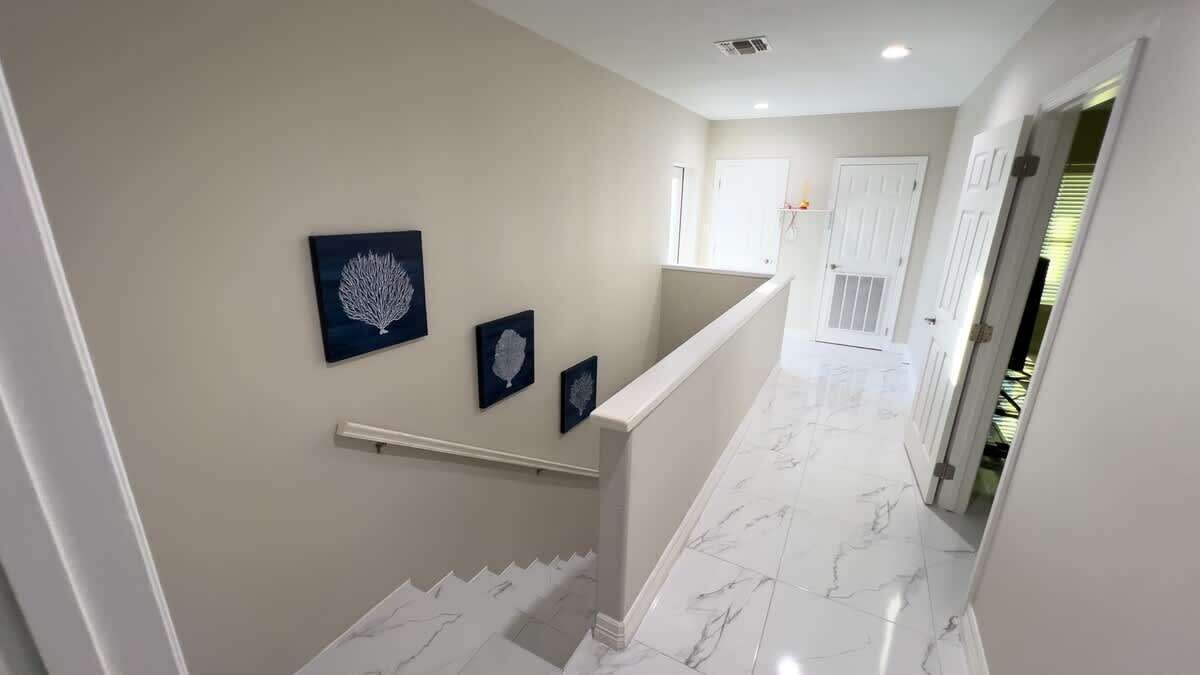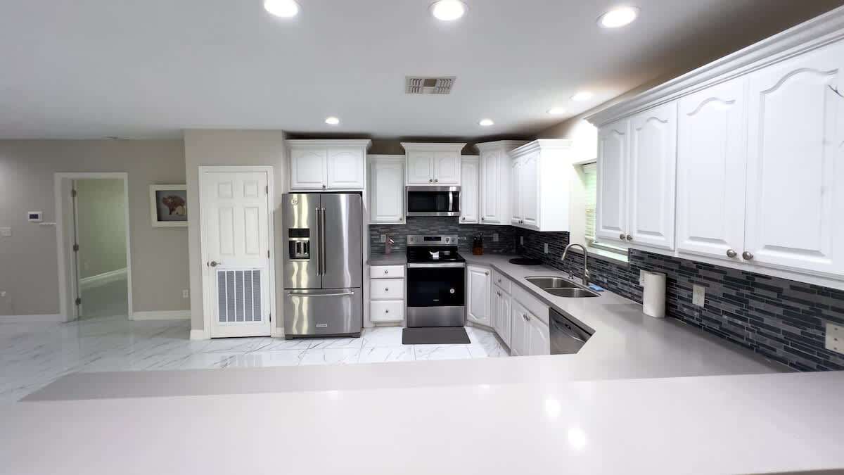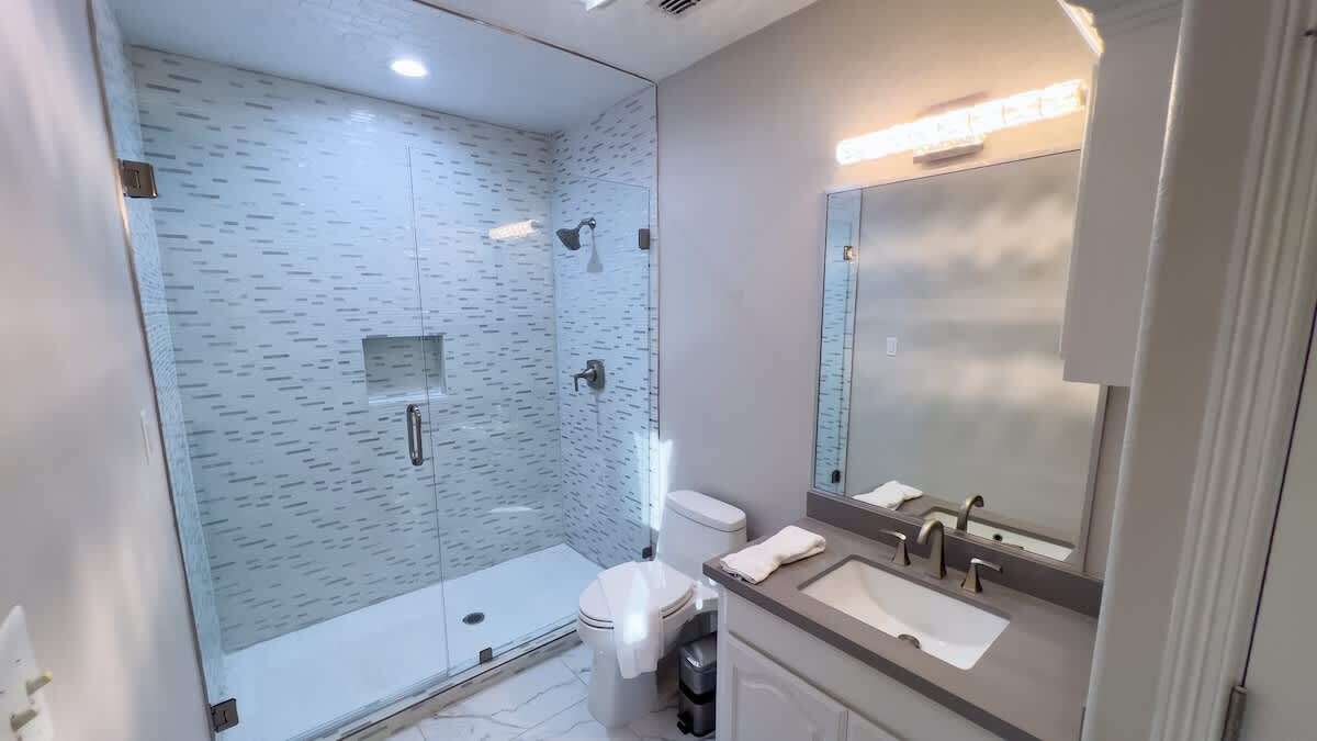 This two level home was completely remodeled last year top to bottom a complete rebuild. New eat in kitchen with white quartz & all high end stainless appliances, all new gloss white ceramic floors, new walk in massive tile showers & more.