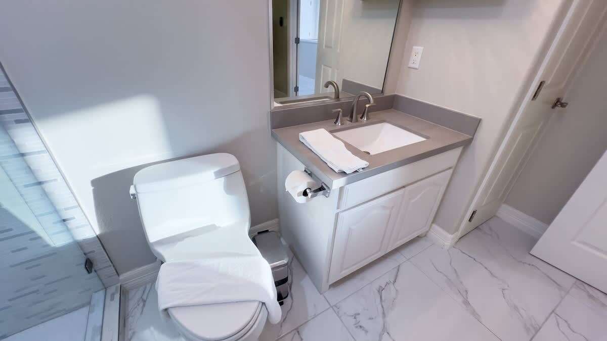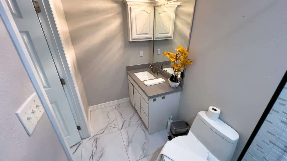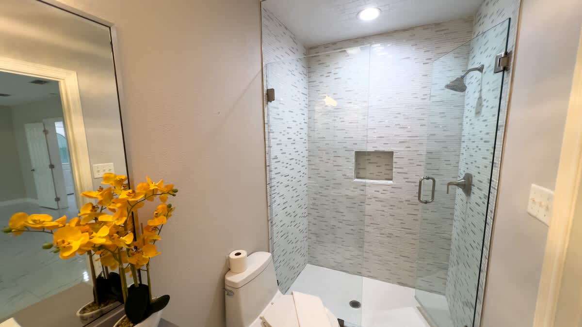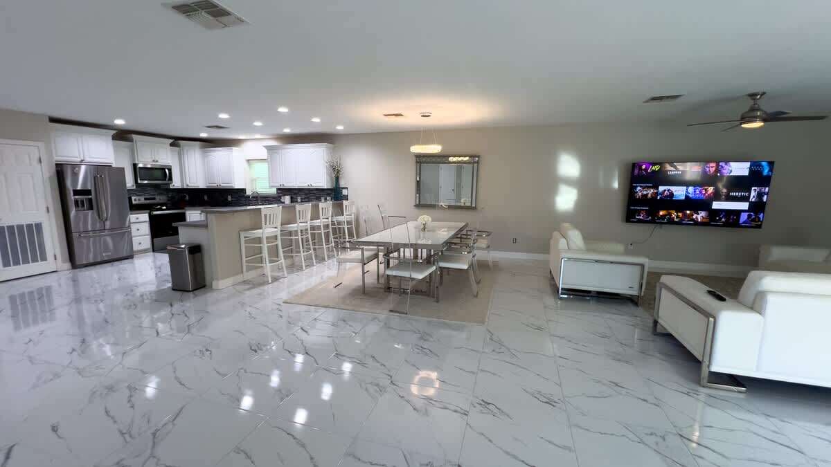 This two level home was completely remodeled last year top to bottom a complete rebuild. New eat in kitchen with white quartz & all high end stainless appliances, all new gloss white ceramic floors, new walk in massive tile showers & more.