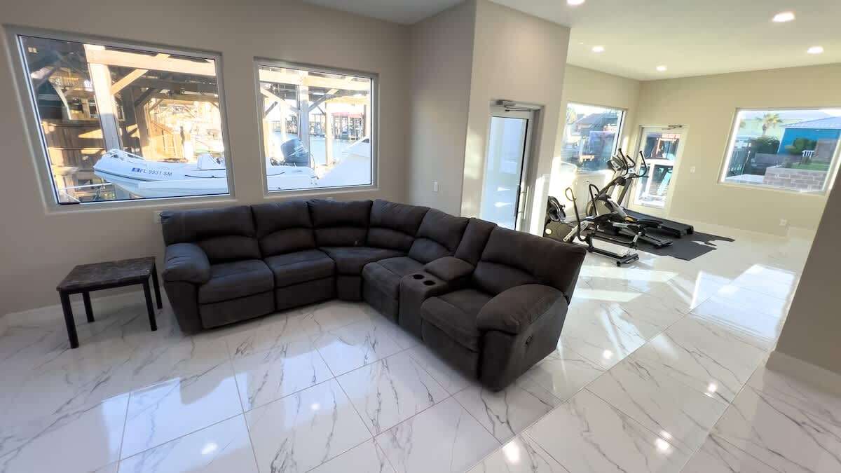 On the main floor is a 2 car garage (1 space may be used other space for owner use), walk thru breezeway to the water, as well as main floor bath, kitchen, living room, really great 4 season porch off the bulkhead & doc with a couch and new flat screens for movie nights or a nice play area in AC for your kiddos.