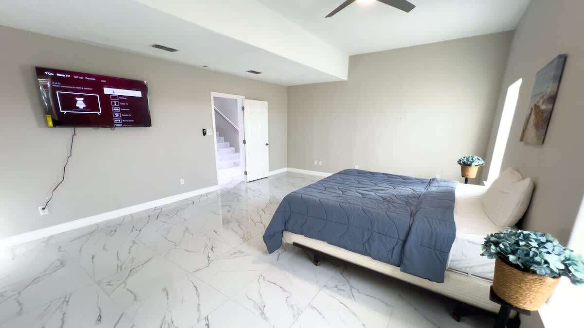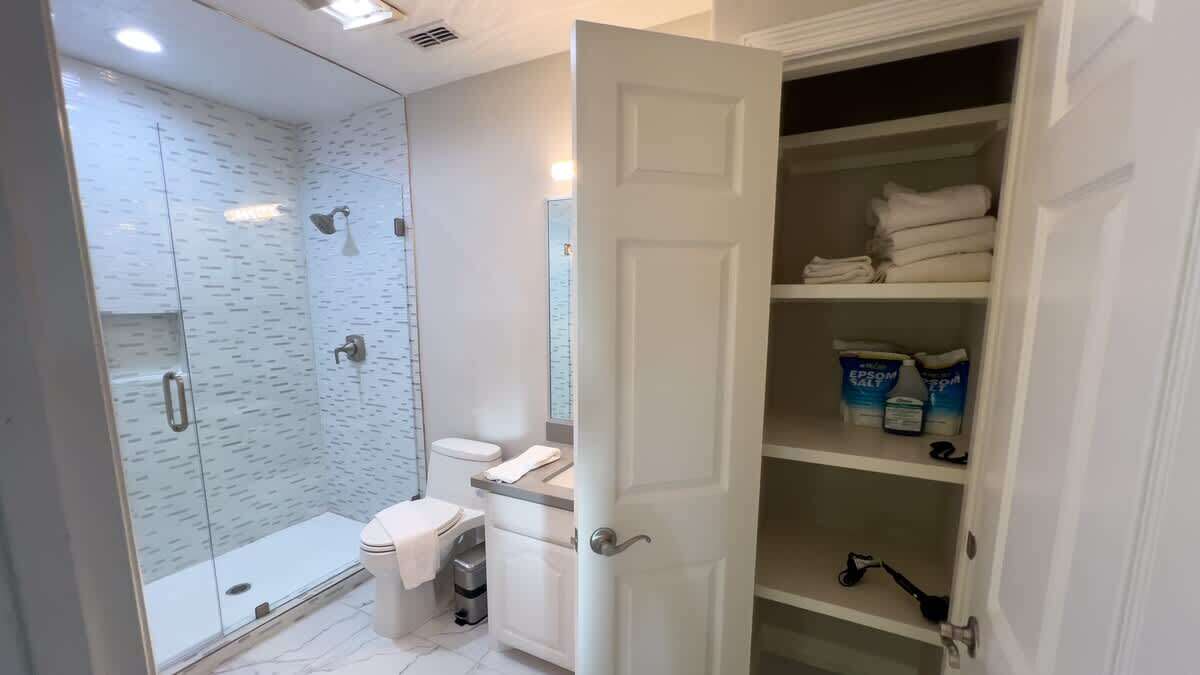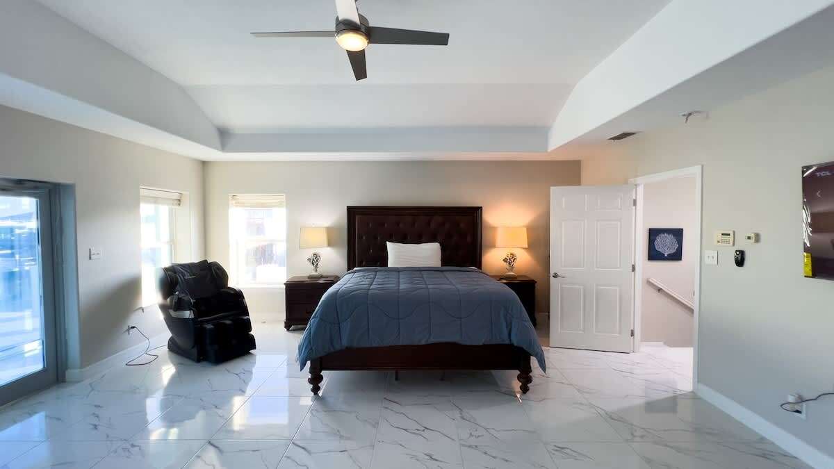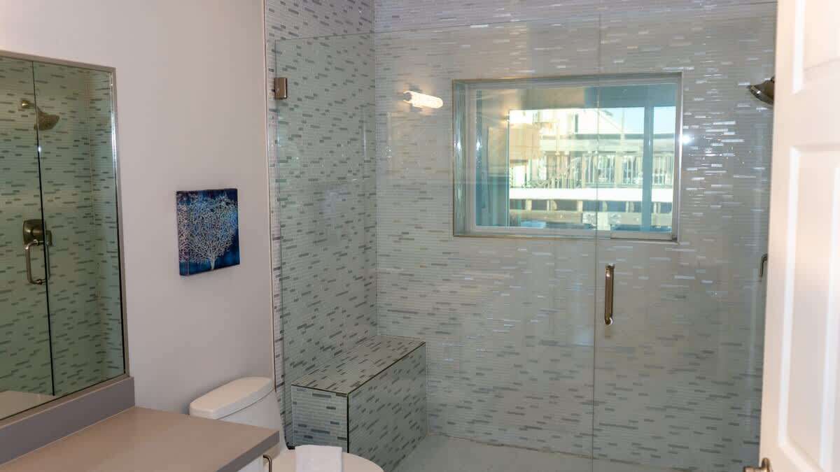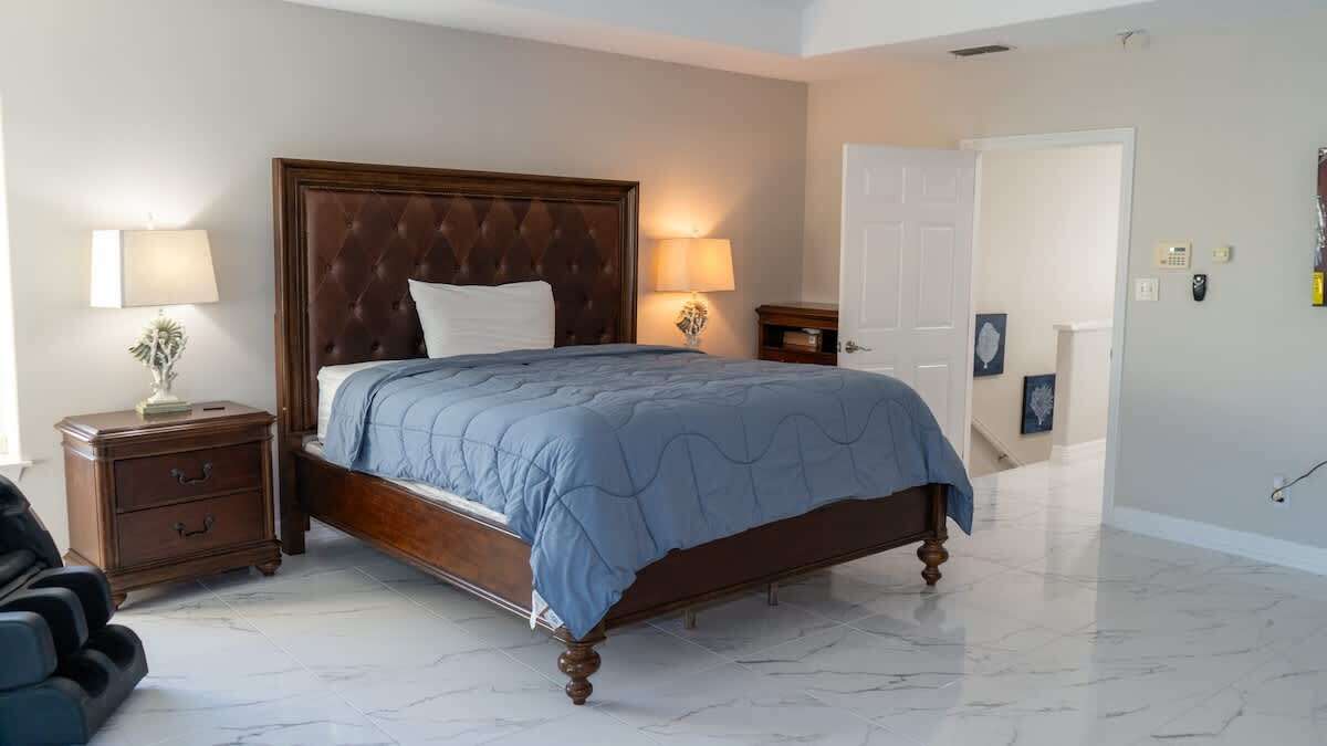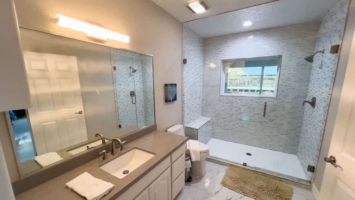 Upstairs you will find the 3 bedrooms and 2 more bathrooms with huge walk in new showers. The bedrooms all have a king bed. The 2 spare bedrooms also have fold down futons that can be moved around for extra sleeping space.