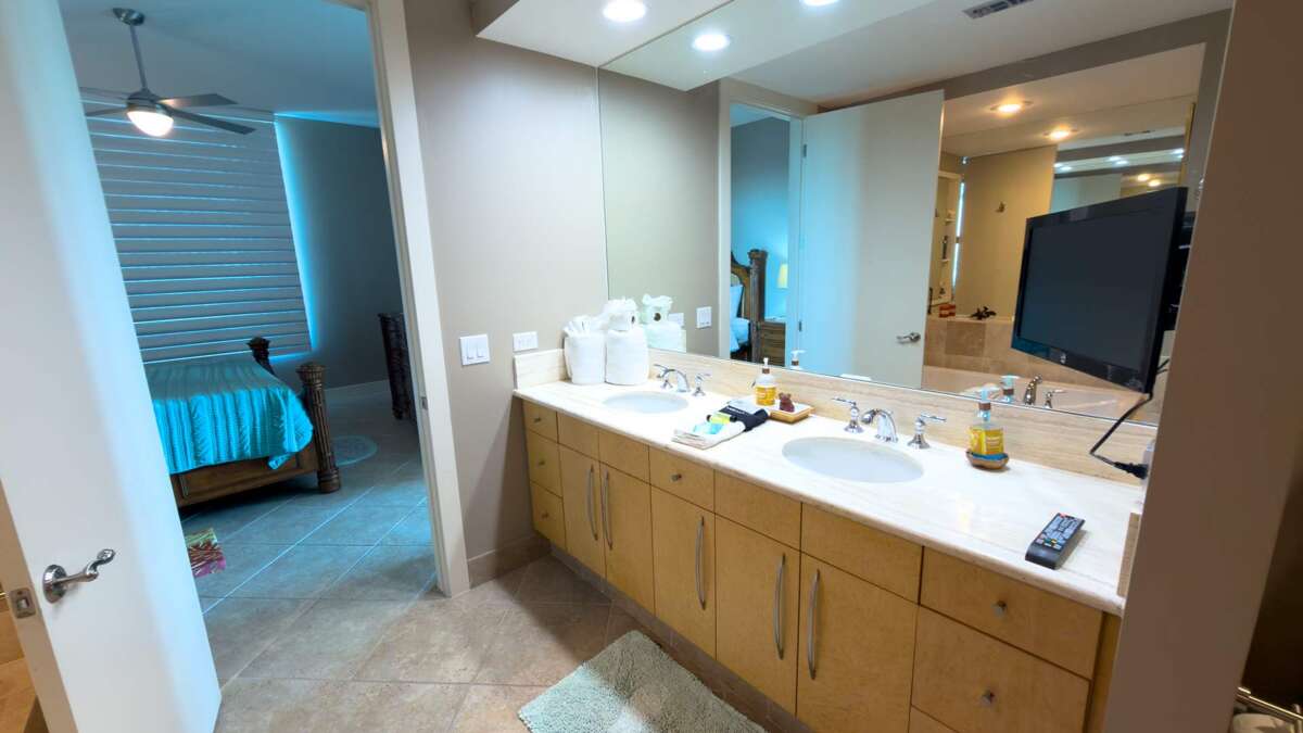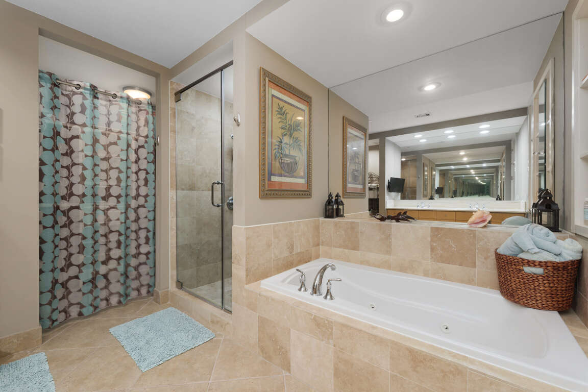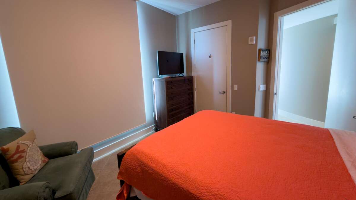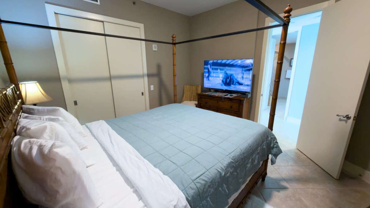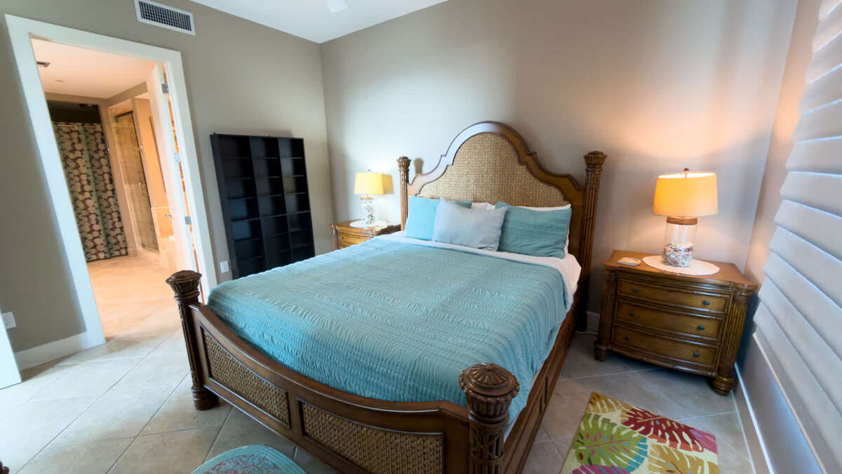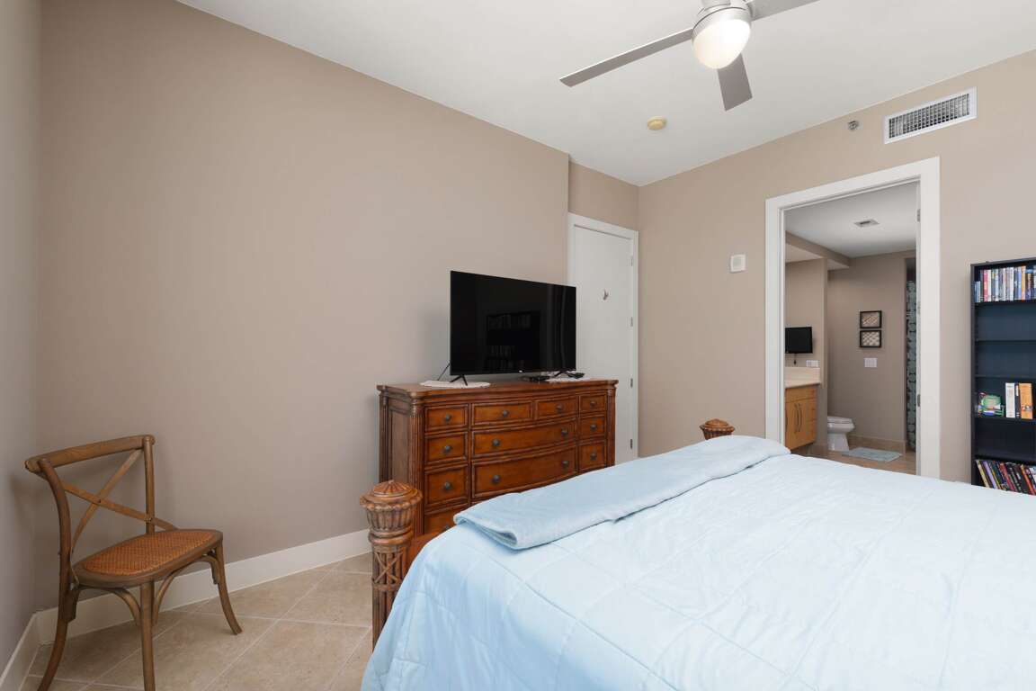 This Sapphire has three bedrooms and three bathrooms. The master bedroom features a king size bed with a large en suite bathroom. The second bedroom features a king sized bed and the 3rd Bedroom features a queen sized bed. The condo features an oceanside balcony and a bayside balcony.