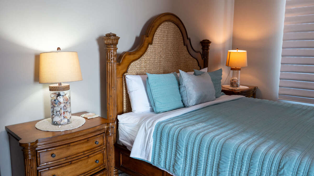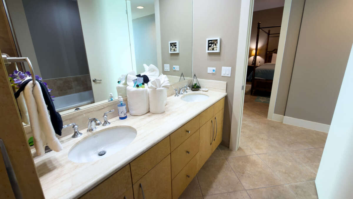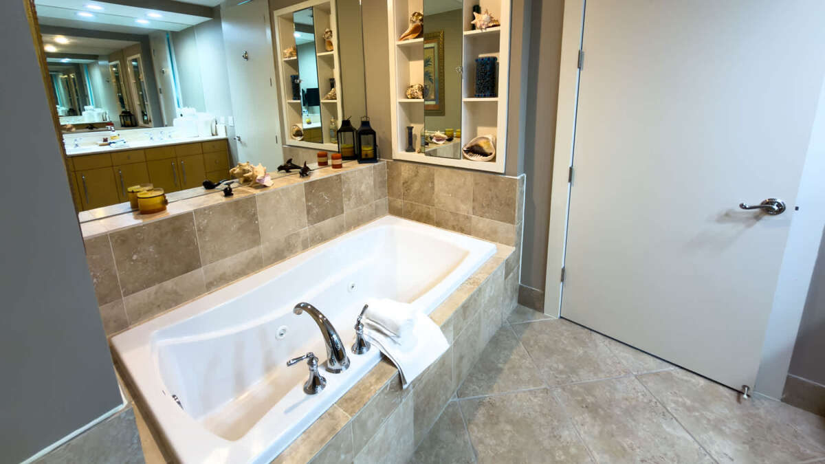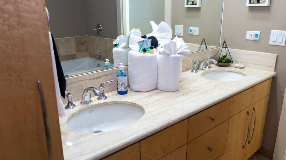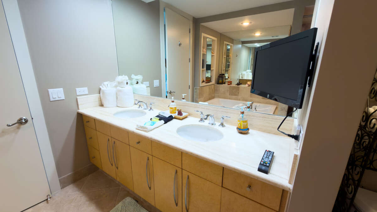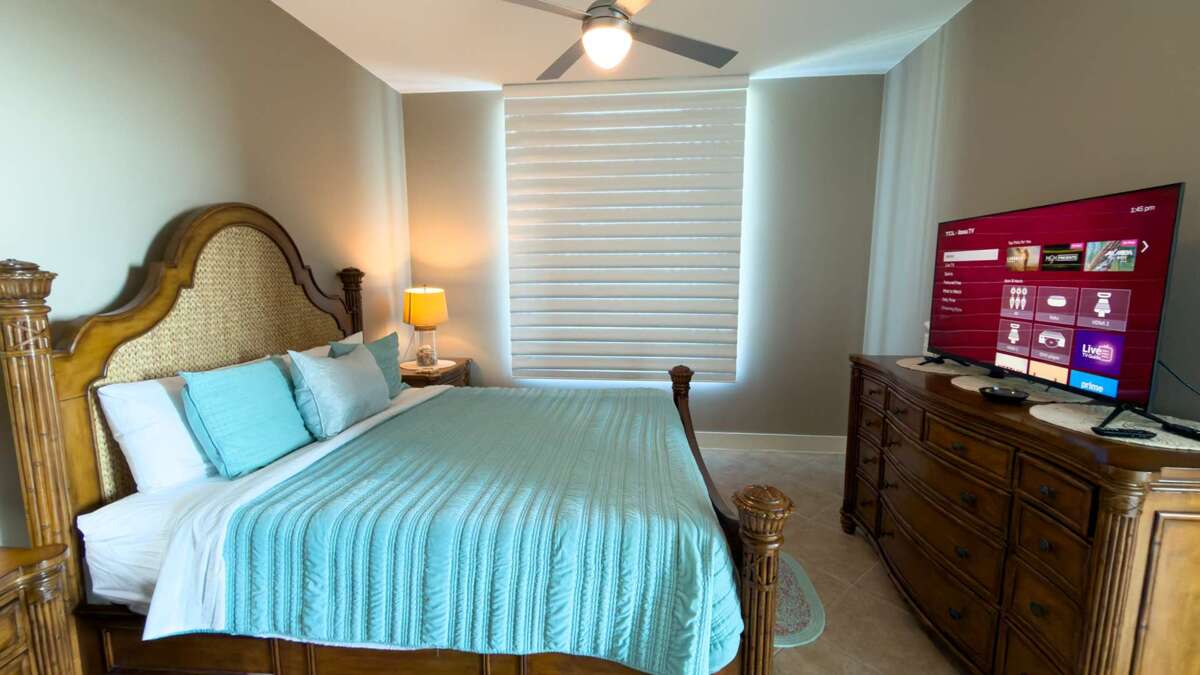 This Sapphire has three bedrooms and three bathrooms. The master bedroom features a king size bed with a large en suite bathroom. The second bedroom features a king sized bed and the 3rd Bedroom features a queen sized bed. The condo features an oceanside balcony and a bayside balcony.