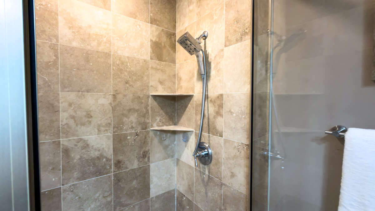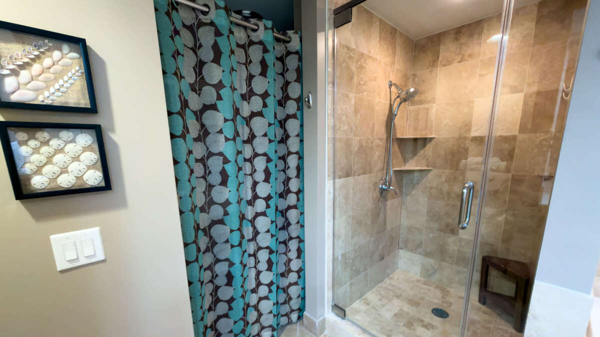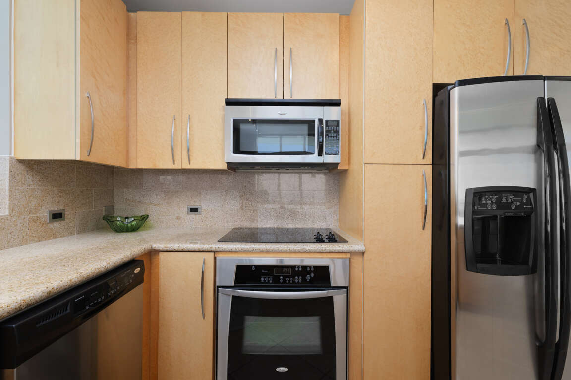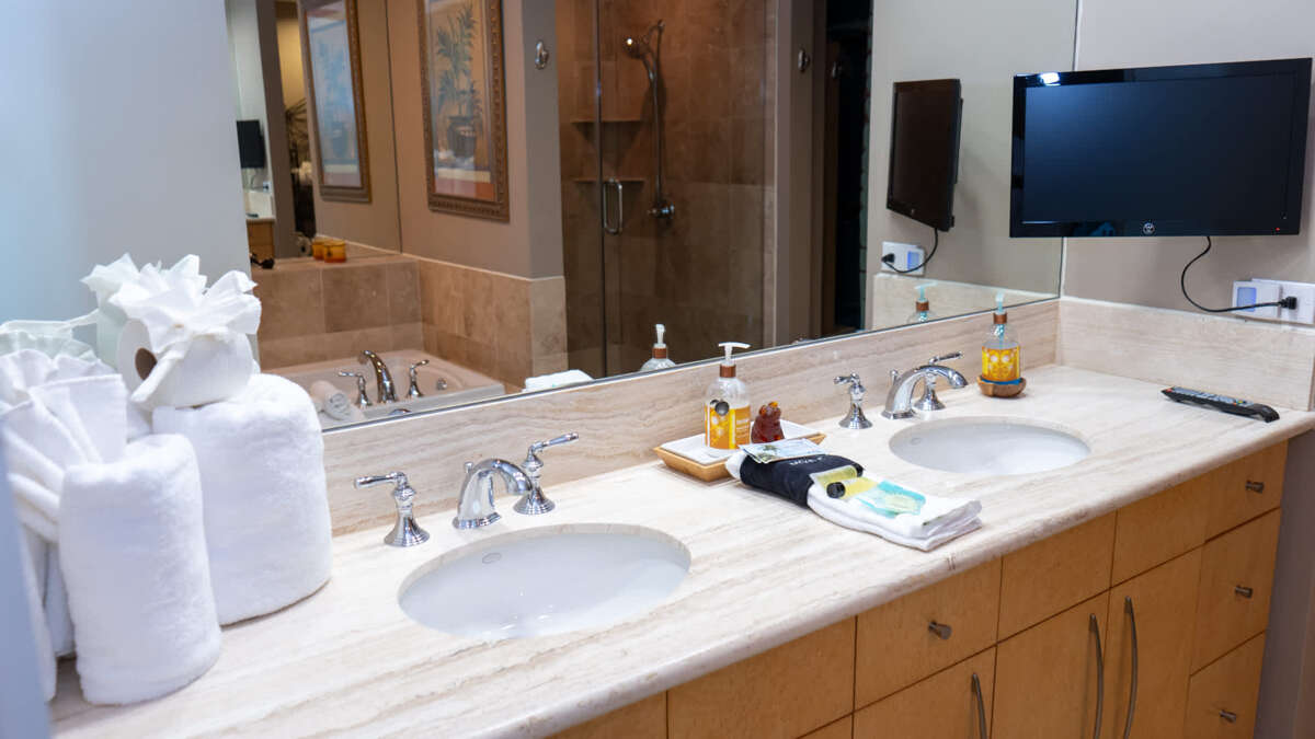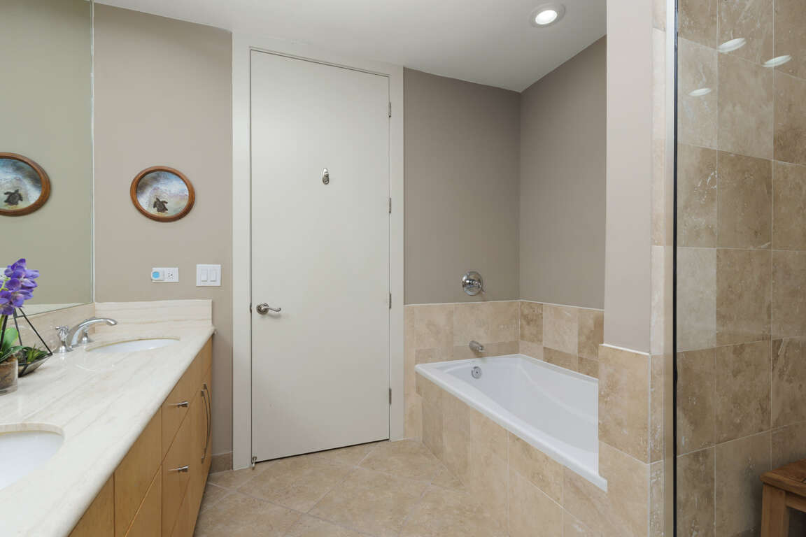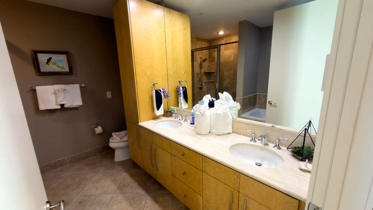 This Sapphire has three bedrooms and three bathrooms. The master bedroom features a king size bed with a large en suite bathroom. The second bedroom features a king sized bed and the 3rd Bedroom features a queen sized bed. The condo features an oceanside balcony and a bayside balcony.