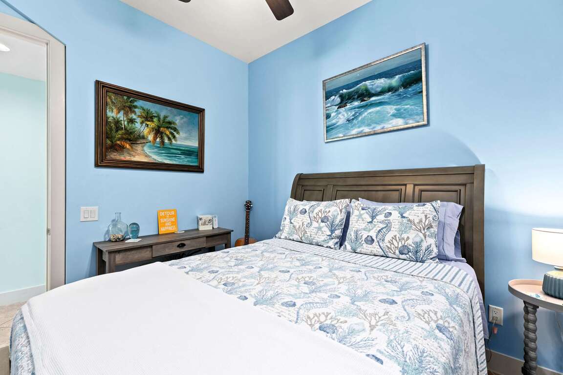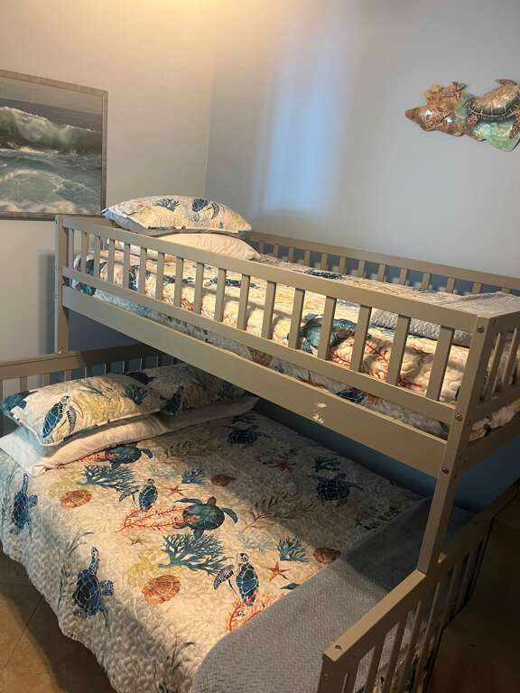 The second bedroom features a queen/twin bunk bed with a full bath.