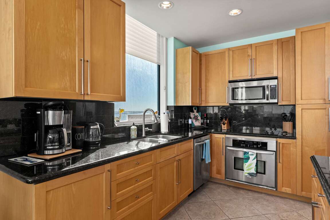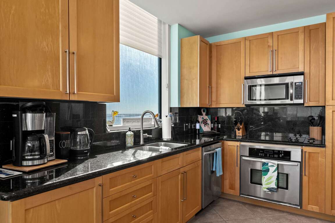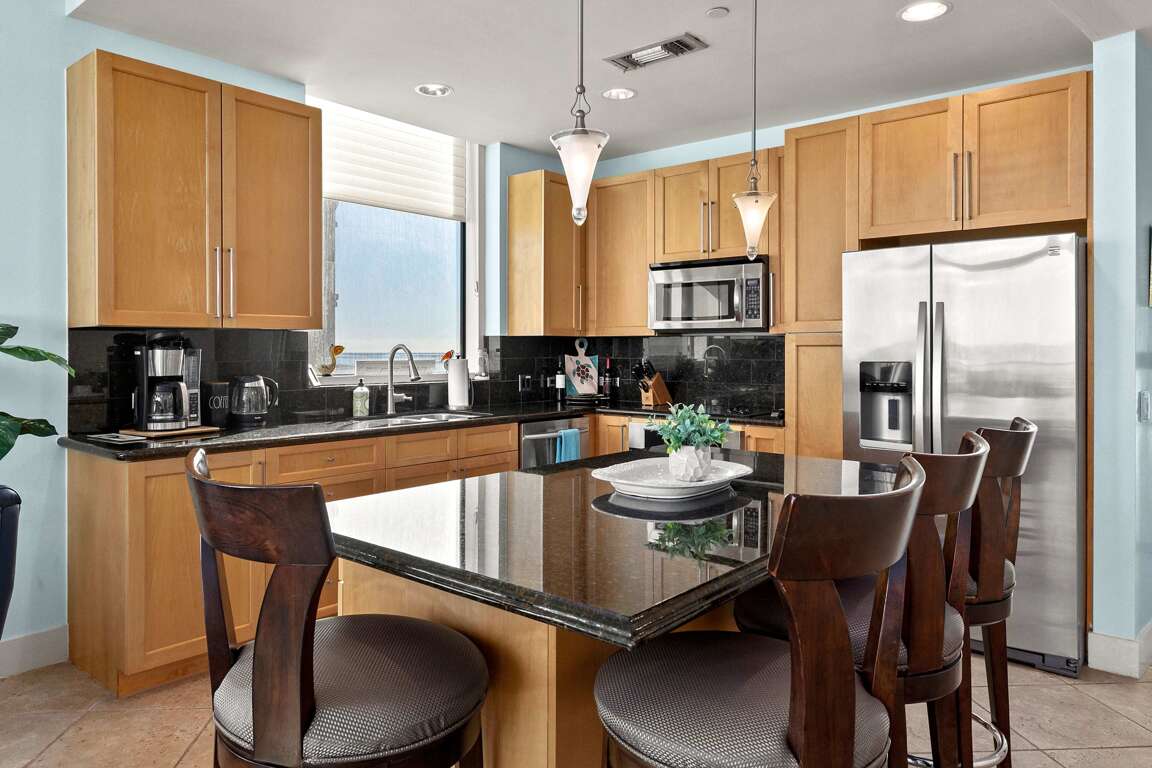 Property has an eat in kitchen that flows to living room & out to the beach patio overlooking pool way, way up high. The kitchen is fully equipped with all pots, pans, dishes etc to enjoy memorable home cooked meals saving time & creating memories!