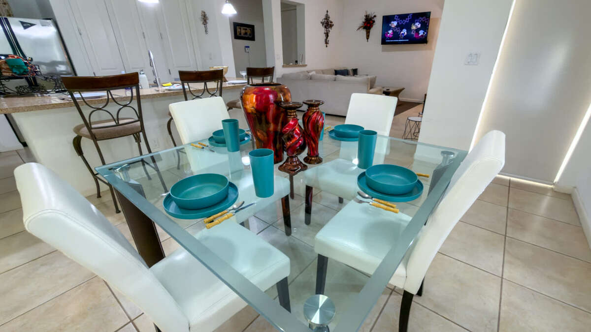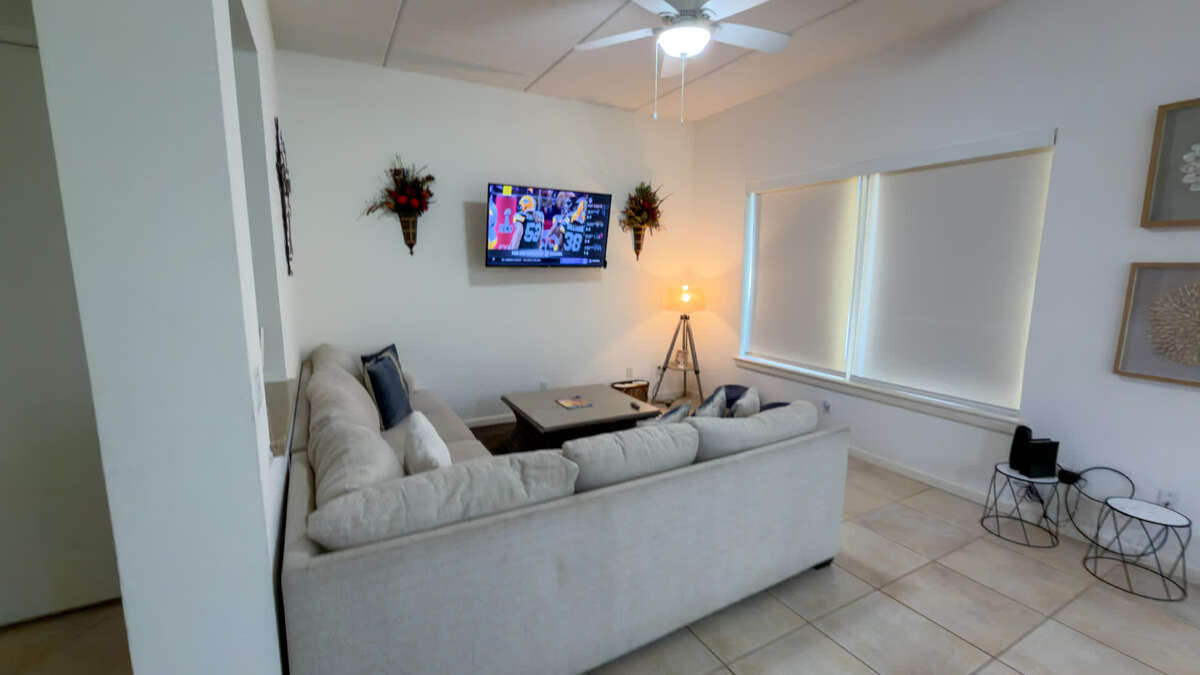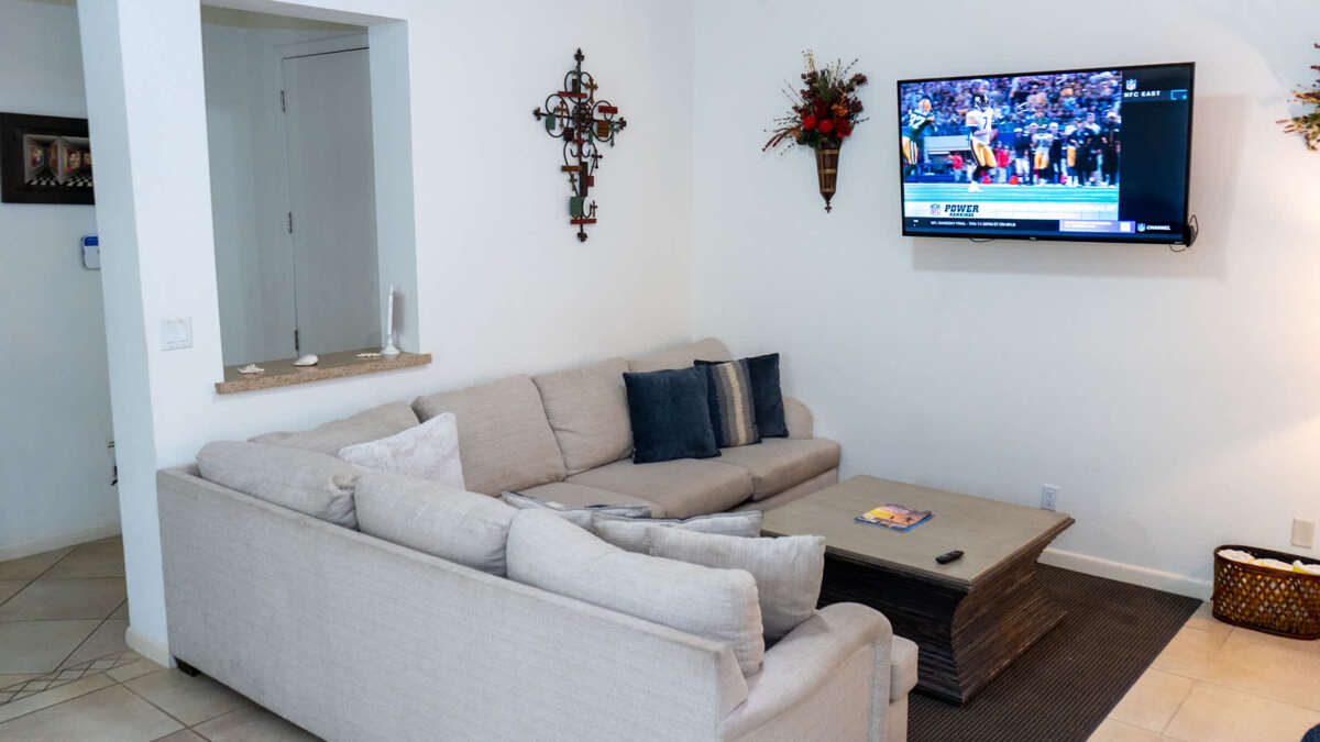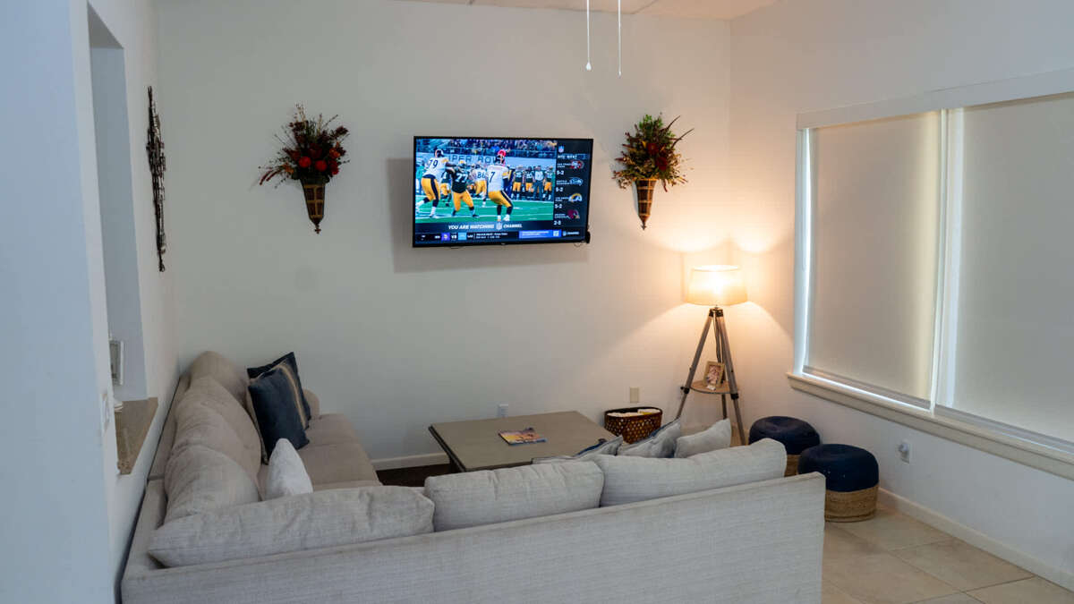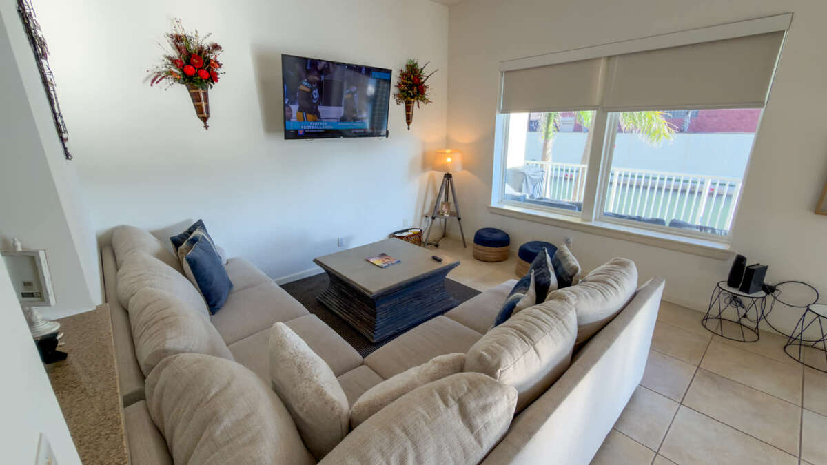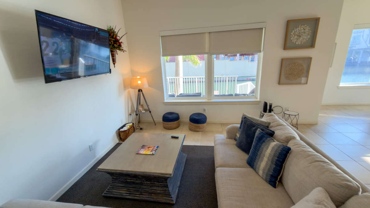 The living room is quite large with comfortable seating & the couch is large enough if you have a late night TV watcher that wants to stretch out & lie down - with views of the water, patio & boat slip areas.- great to watch the larger flat screen smart TV or play a family board game night for great conversation & memories. This flows openly to the kitchen/dining area