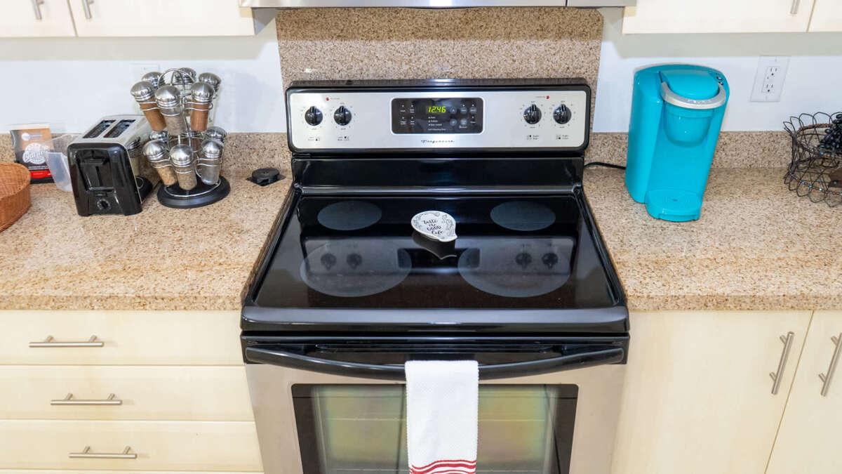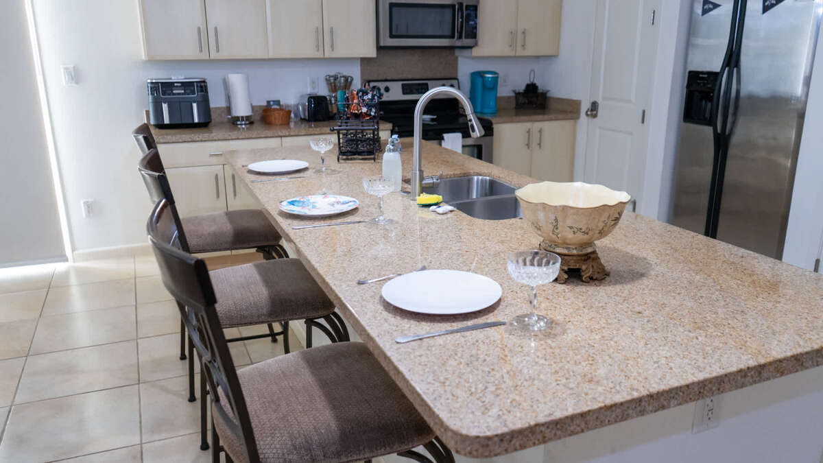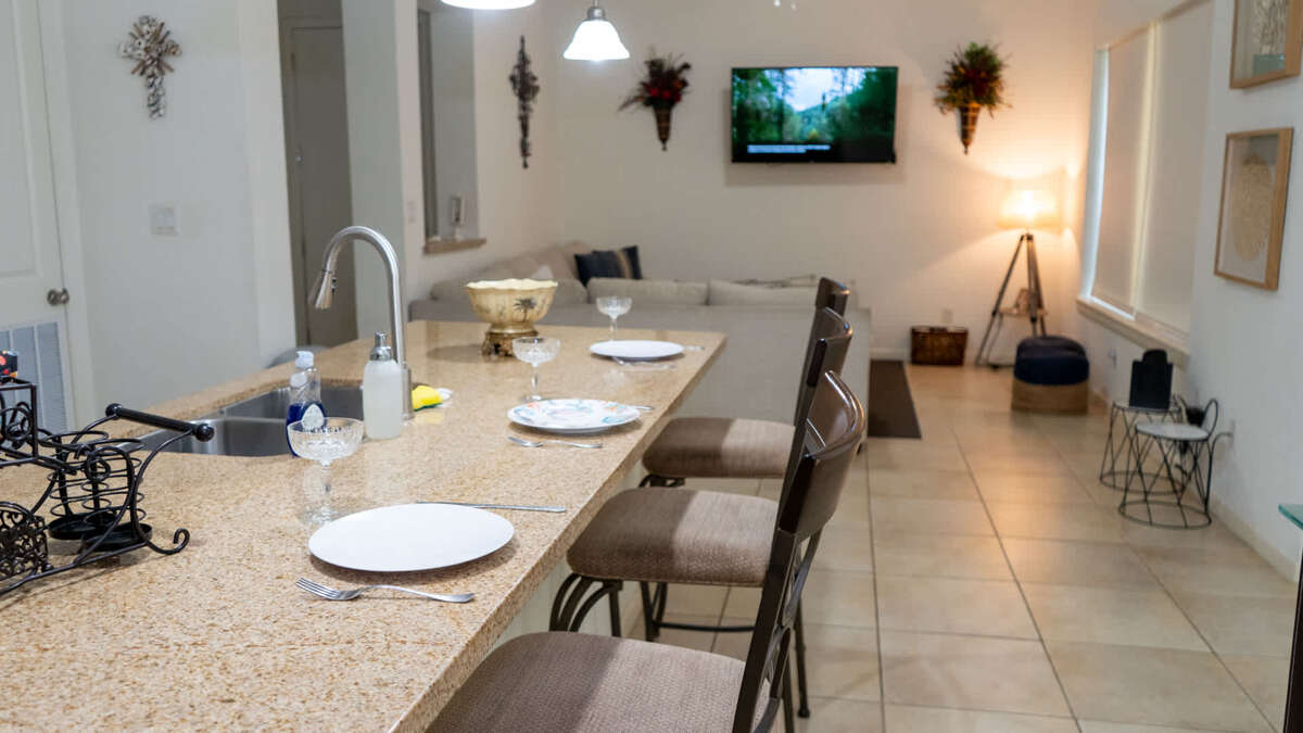 The eat in granite counter is perfect to also get some work done on your laptop (yes – wifi / internet free) plus ample additional dining table & chairs. Speaking of the kitchen ours if fully equipped with all pots, pans dishes – just bring your food to enjoy more convenient & affordable home cooked meals.