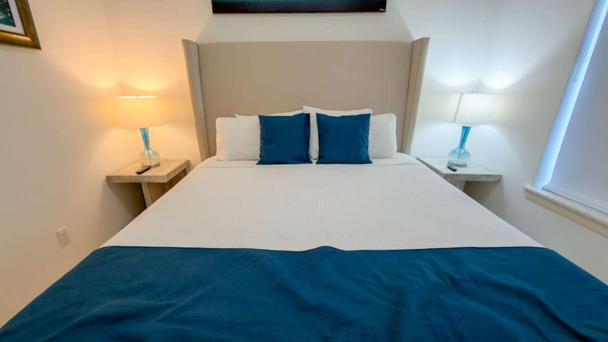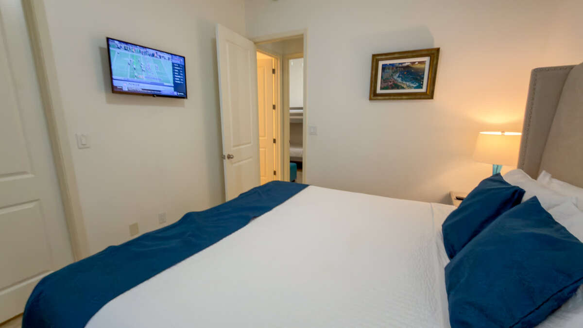 In the master bedroom you will find a king bed, flat screen smart TV, and connected en suite full bathroom.
