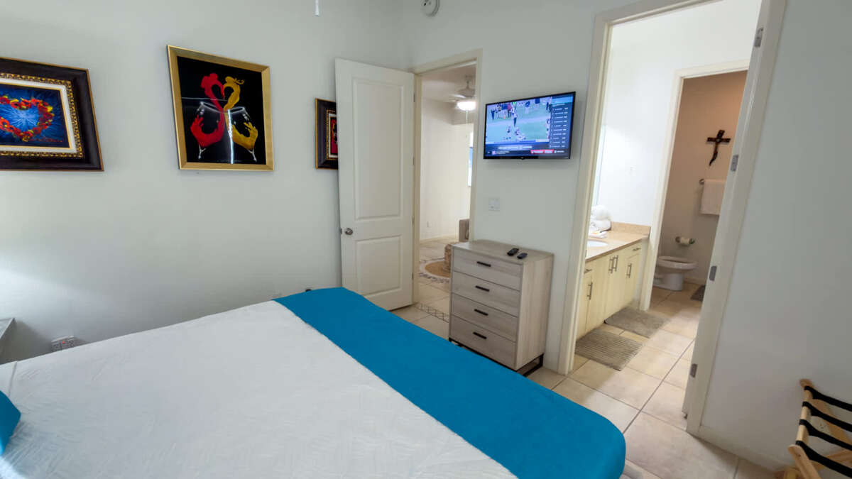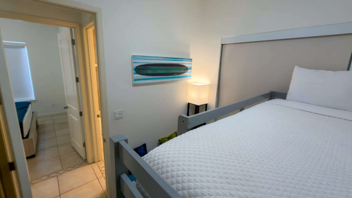 The second guest bedroom has a queen bed There is another small flat screen in here for kiddos to watch at the end of the day. This bedroom is adjacent to the full bathroom as well.
