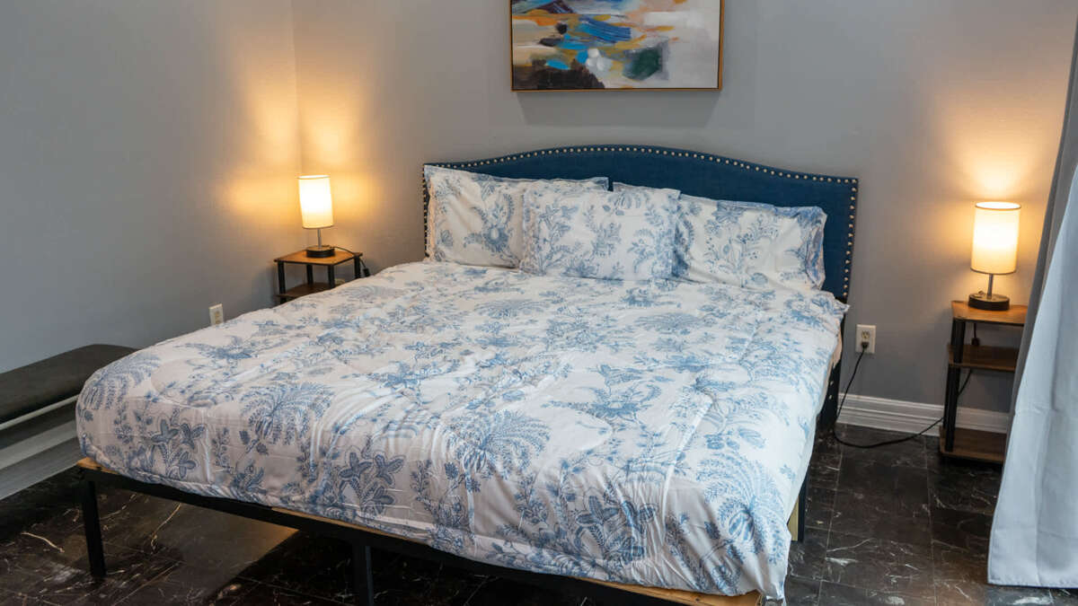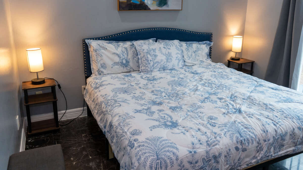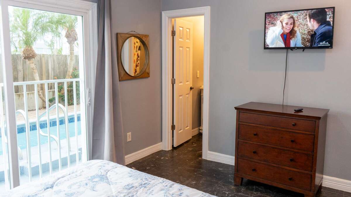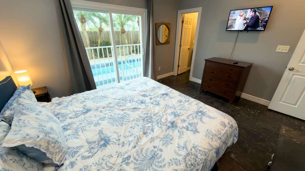 This ground-floor condo (no stairs!) is one of only four units in the building and offers shared access to a quiet / small backyard pool. Inside, you’ll find a clean, simple space with all-tile floors, high ceilings, an eat-in kitchen counter, and a cozy corner-bench dining area—great for family meals or game nights. This property does not have a dishwasher unfortunately The condo has 2 bedrooms and 2 full bathrooms. We allow up to 8 people including babies & toddlers, though the sleeping arrangements are best suited when some guests are children. The master bedroom features a king bed and private en suite bathroom.