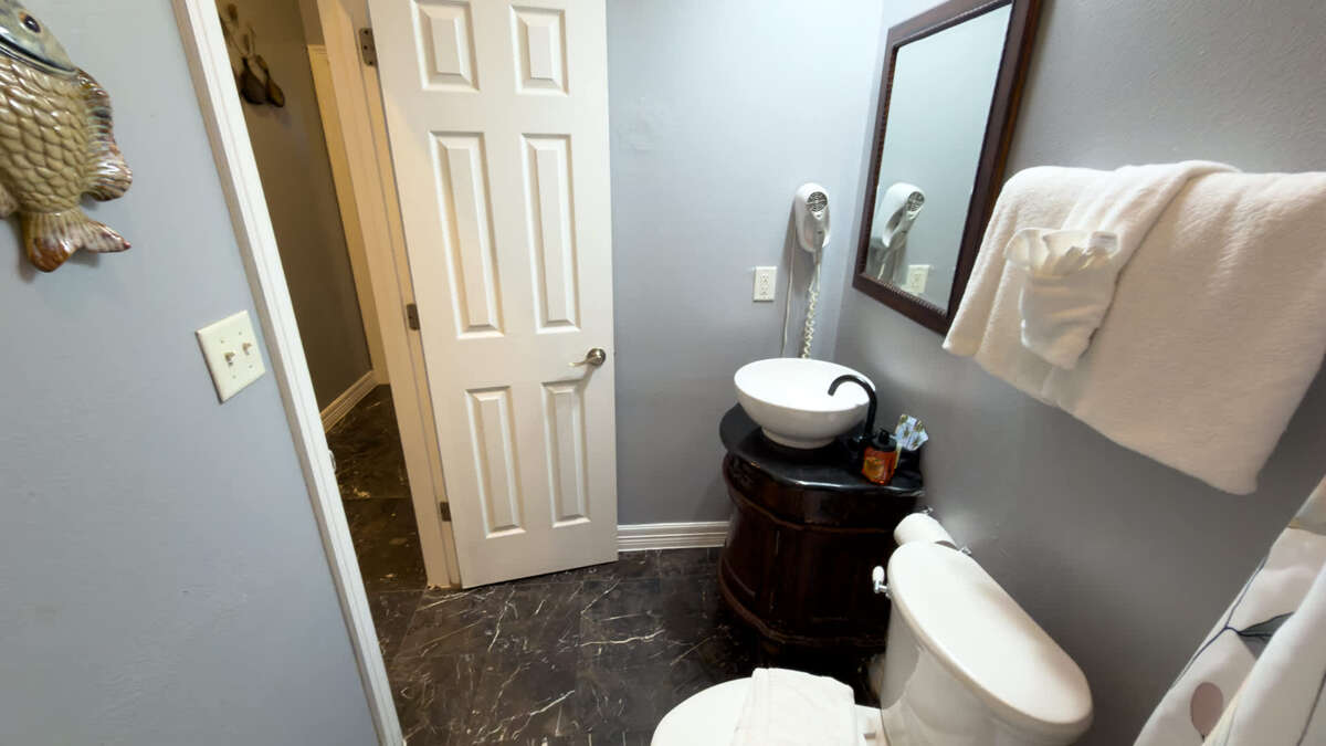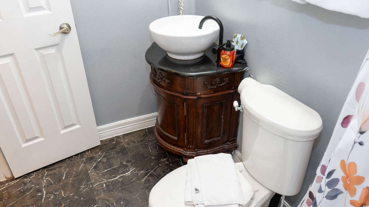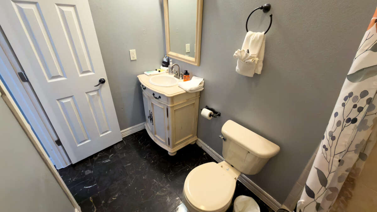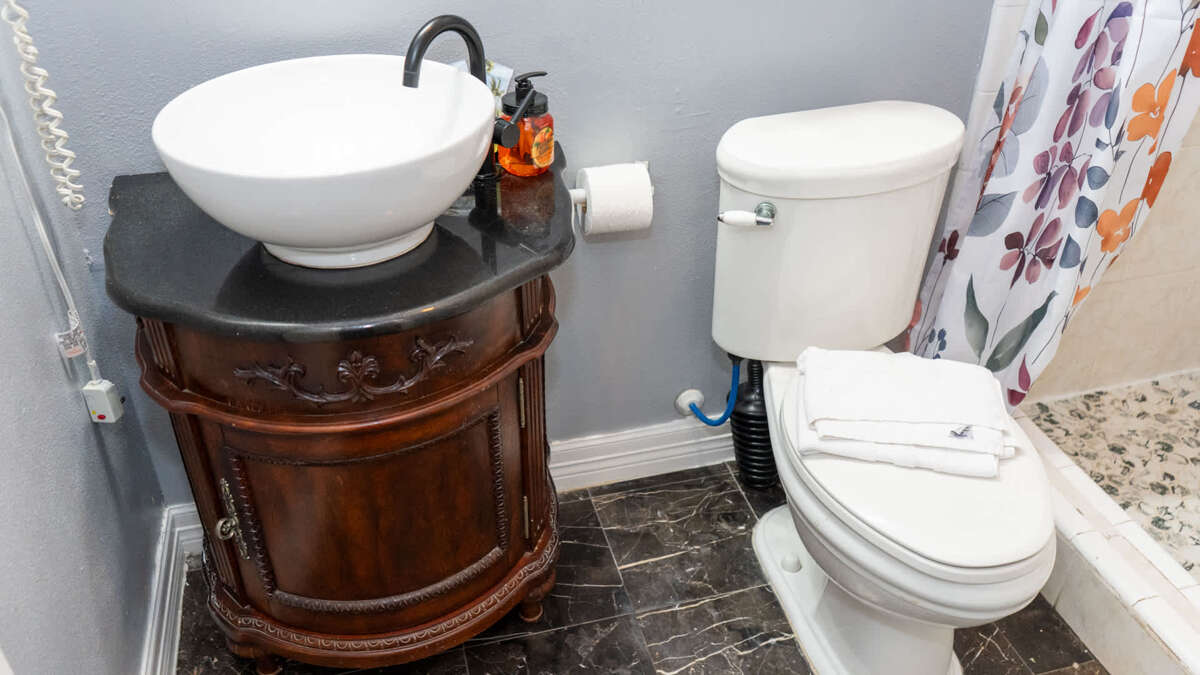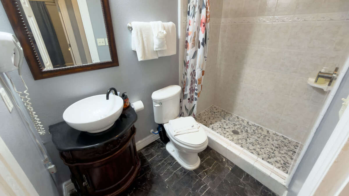 This ground-floor condo (no stairs!) is one of only four units in the building and offers shared access to a quiet / small backyard pool. Inside, you’ll find a clean, simple space with all-tile floors, high ceilings, an eat-in kitchen counter, and a cozy corner-bench dining area—great for family meals or game nights. This property does not have a dishwasher unfortunately The condo has 2 bedrooms and 2 full bathrooms. We allow up to 8 people including babies & toddlers, though the sleeping arrangements are best suited when some guests are children. The master bedroom features a king bed and private en suite bathroom.