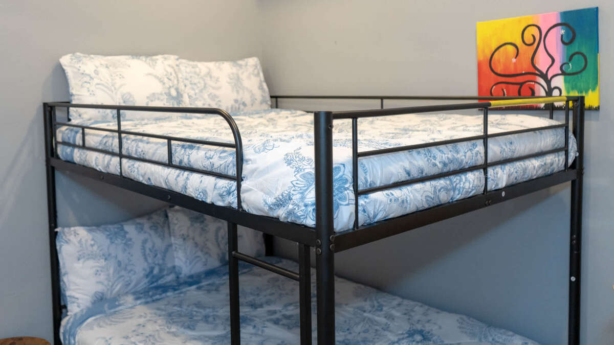 The guest bedroom includes a fun full-over-queen bunk bed with a twin trundle underneath, offering plenty of sleeping options. The living room has a standard couch, and we provide a queen airbed for extra guests—just bring bedding if you plan to use it.