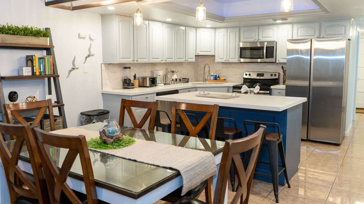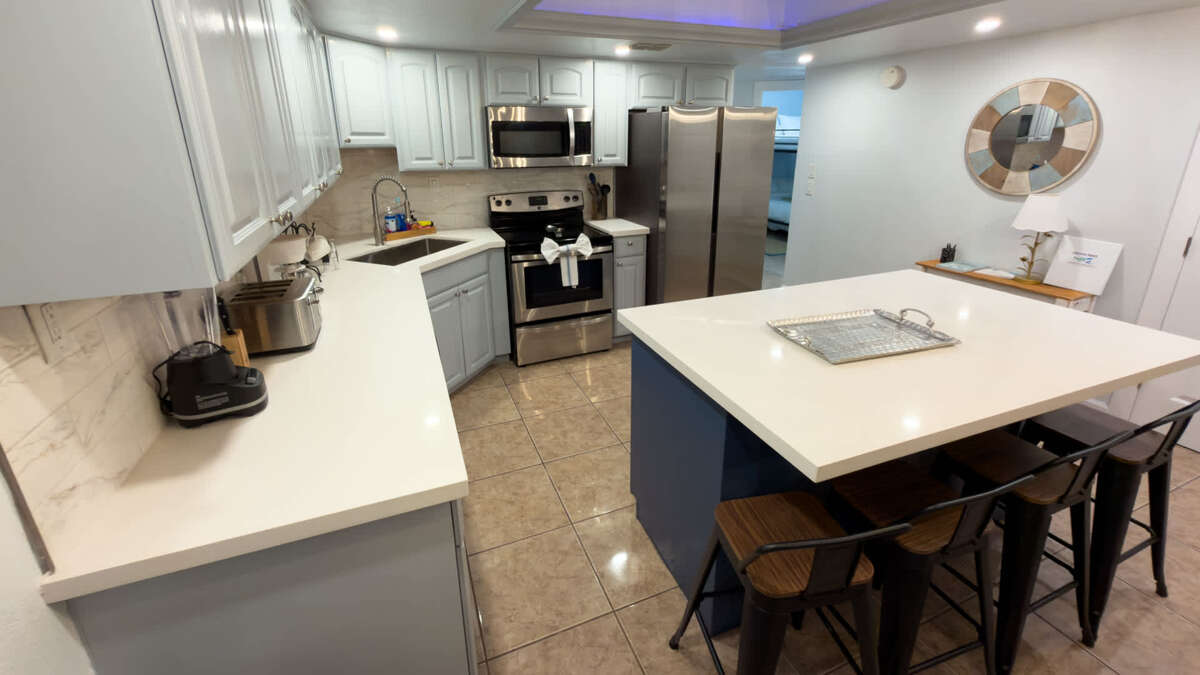 When you enter this space you will immediately notice how clean & open it feels. We professionally clean with all guests with a pre arrival inspection to start with - but many condos on the Island are dated - not this one! Located in tower 3, direct Gulf of America, Mexico, Ocean facing, front door to beachview patio straight through open concept. The new kitchen has white quartz, stainless steel & is fully equipped with all pots & pans. The eat in Island is also great for crushing out some laptop work, and the Family cook won’t feel isolated from the rest of your Fam.