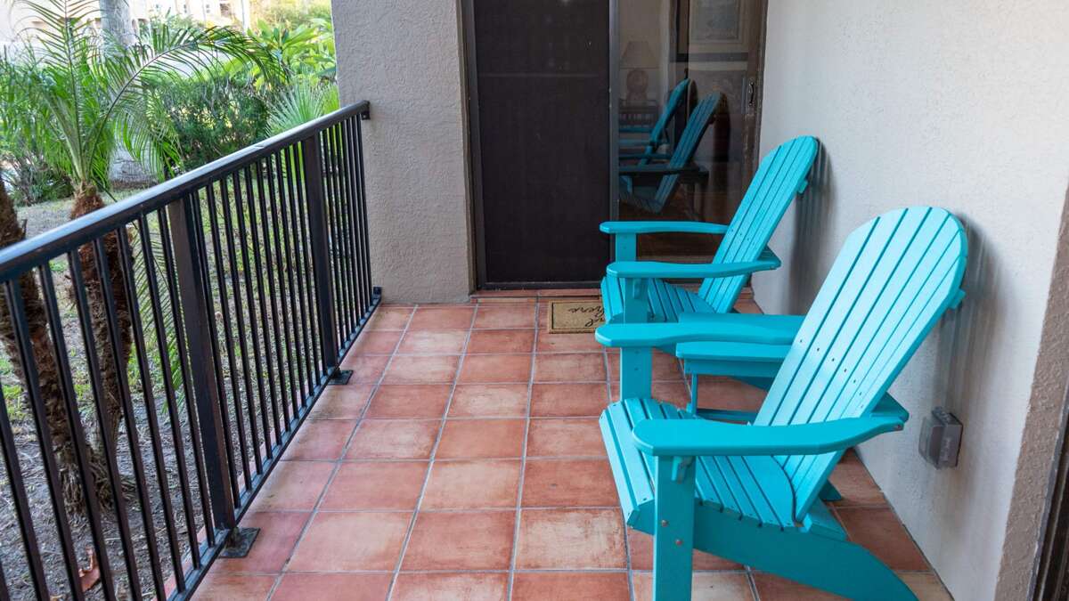 * Outside patio is very nice to just walk out with the plywood Adirondacks. From there you get a peek-a-boo view of the pool & sundeck that’s 30 feet away