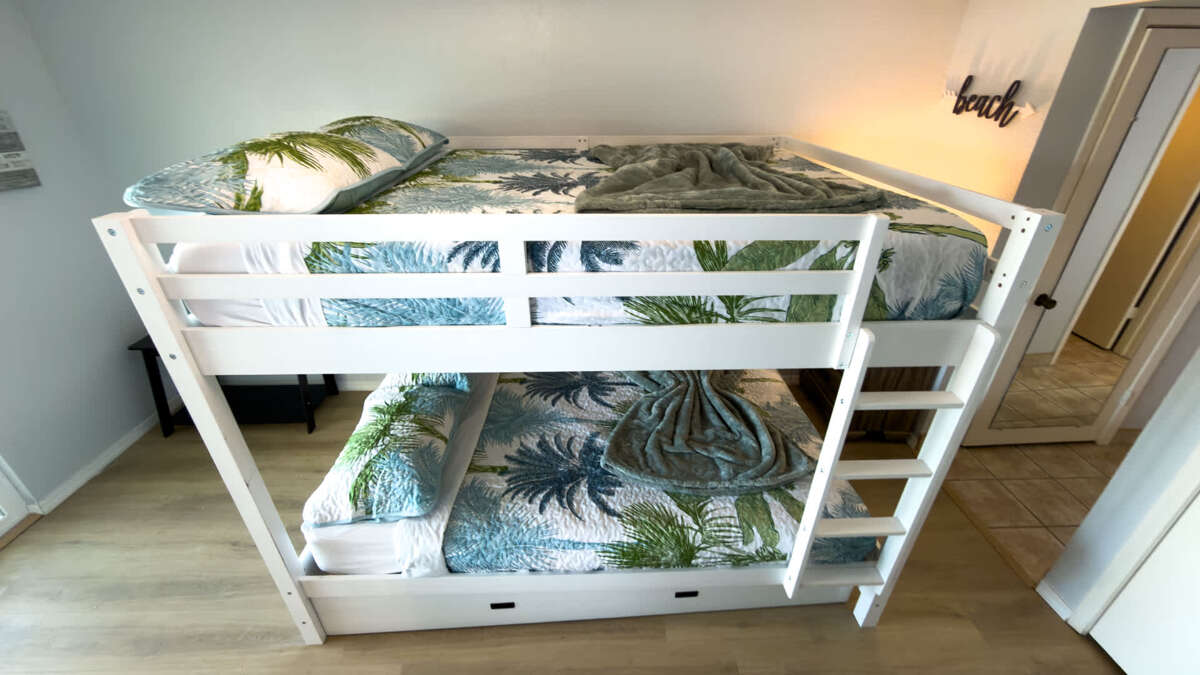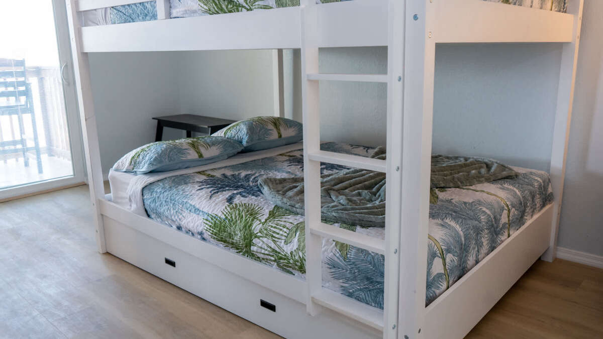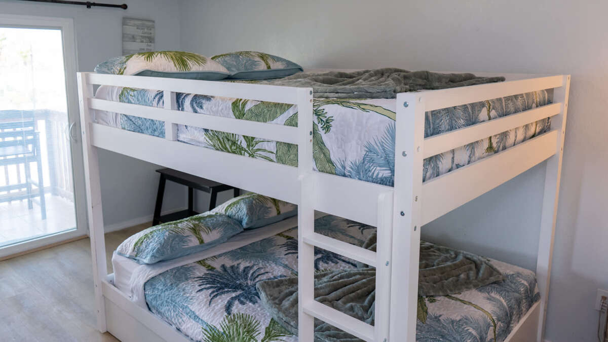* Very ample bedding that is adequate for 2 families to split. Exact bedding is a king in the stated Master bedroom, 2nd bedroom is an adult sized bunk bed with a queen over queen and a pull out trundle bed as a single making for a perfect kids bunk room. In living room is a full sized pull out couch allowing up to 8 people