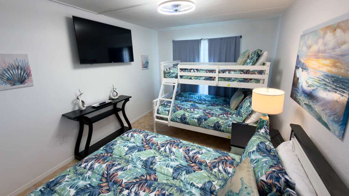 Second-floor apartment vacation rental in South Padre Island with 2 bedrooms, 2 baths, a private patio, pool access, and a short walk to beach entry.