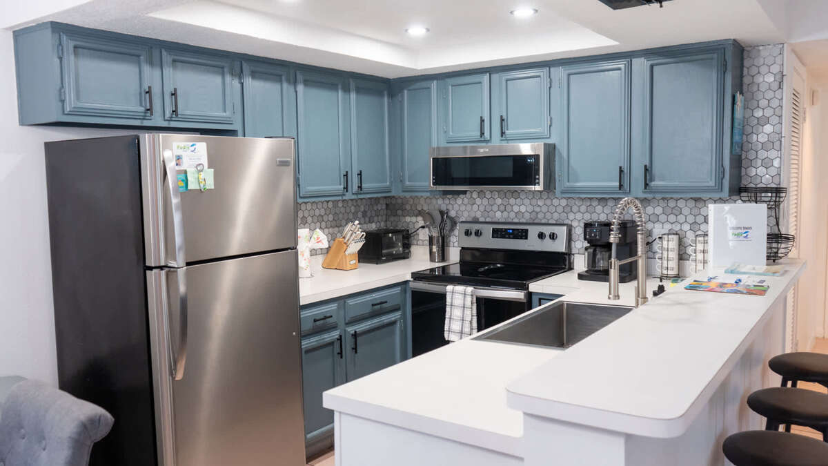 The kitchen is fully equipped with pots, pans, dishes, and cooking essentials for preparing meals & creating great family memories.
