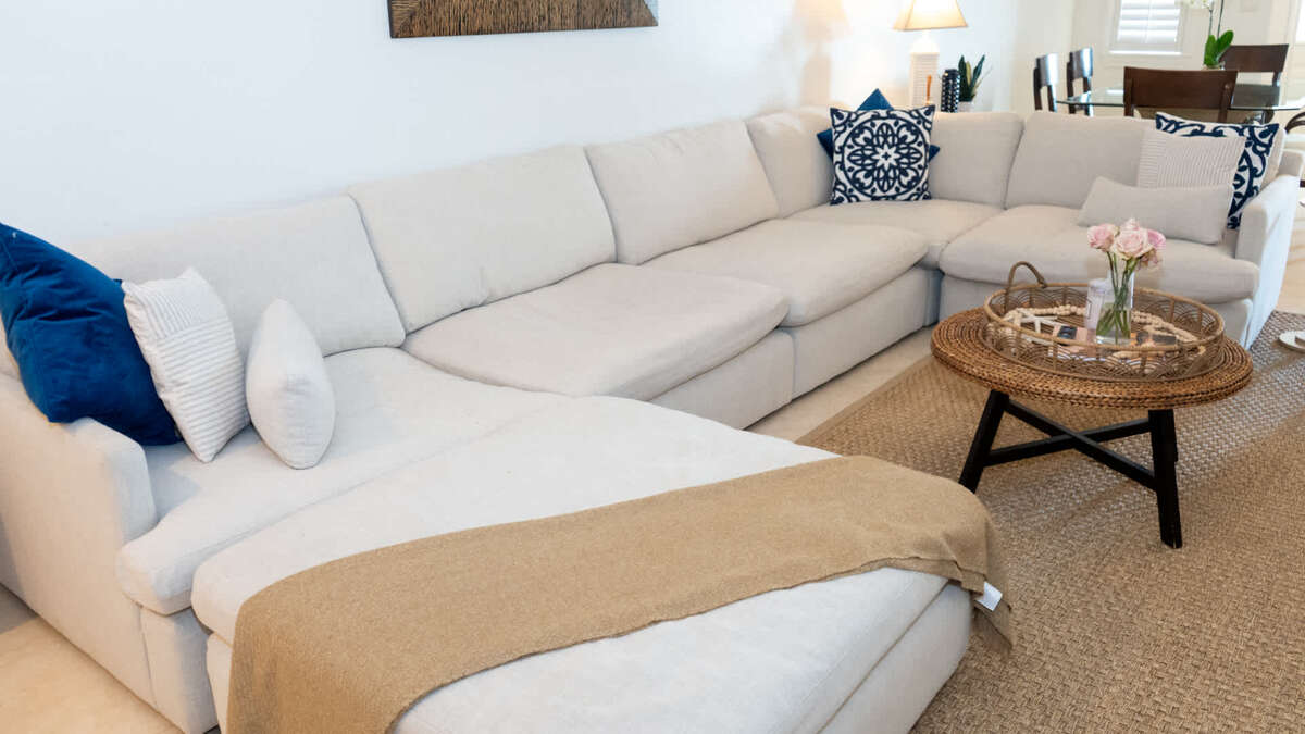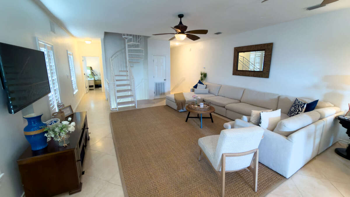 On the Second Level the spacious primary suite with en suite bath sits on one side. On the other side is the large living room with sectional sofa, dining area, and fully equipped kitchen.