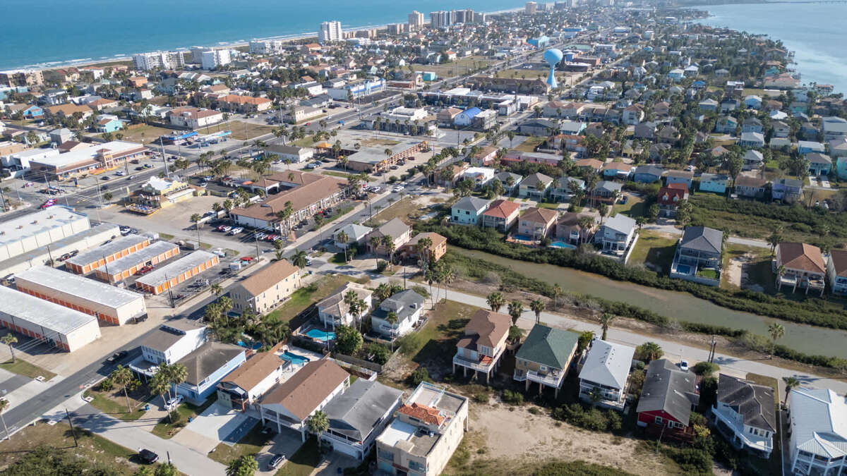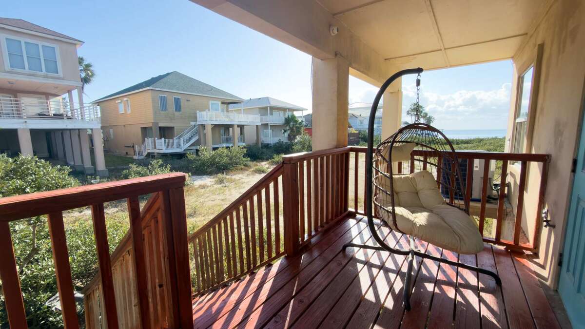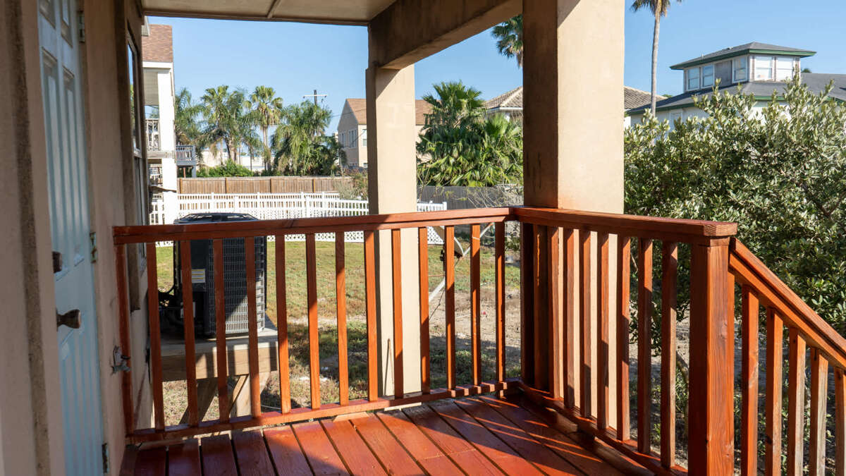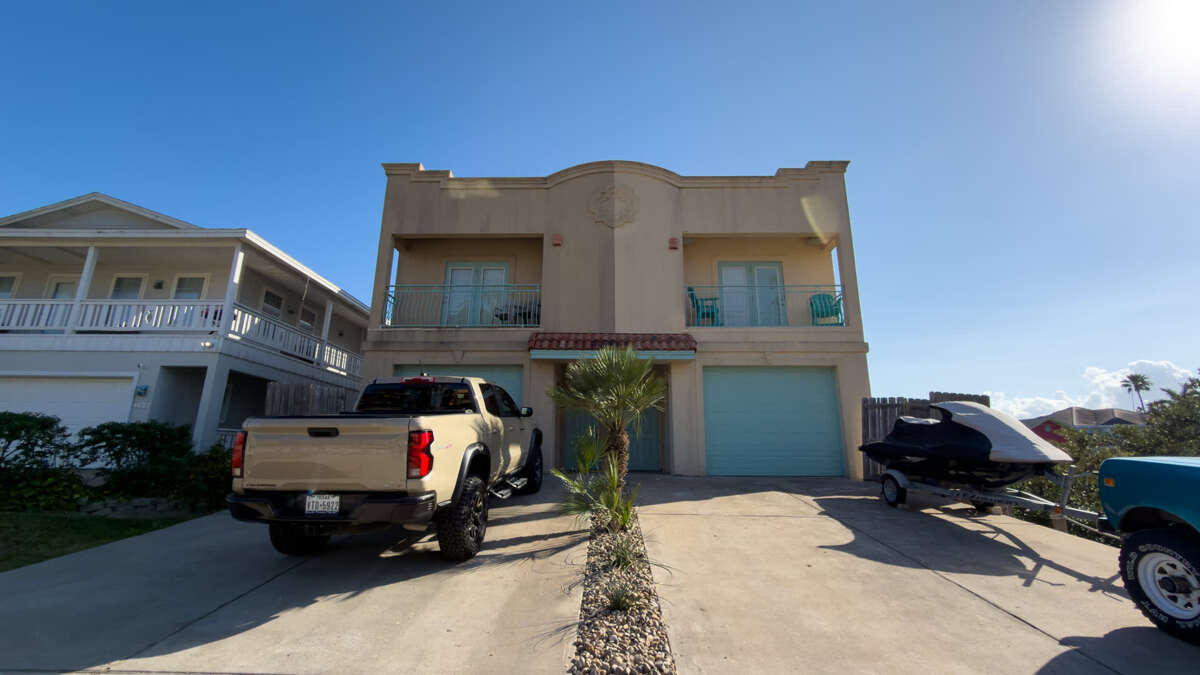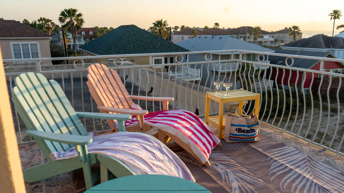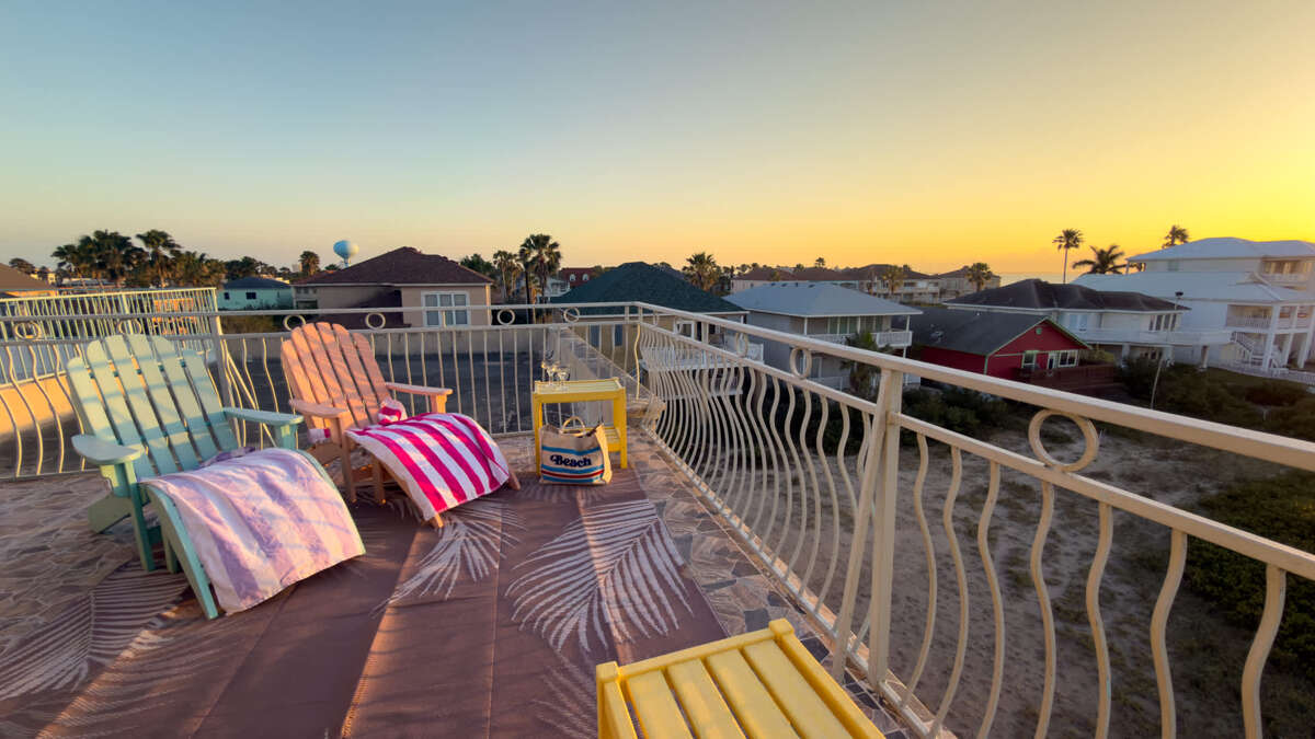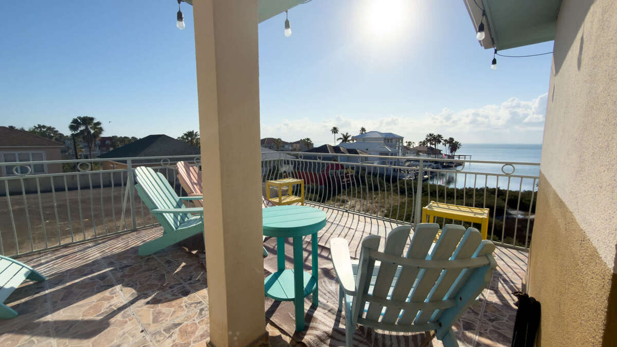 Three-level house in South Padre Island with a rooftop patio for Laguna Madre sunsets, 3 bedrooms, in-unit laundry, and beach access about 2.5 blocks away.