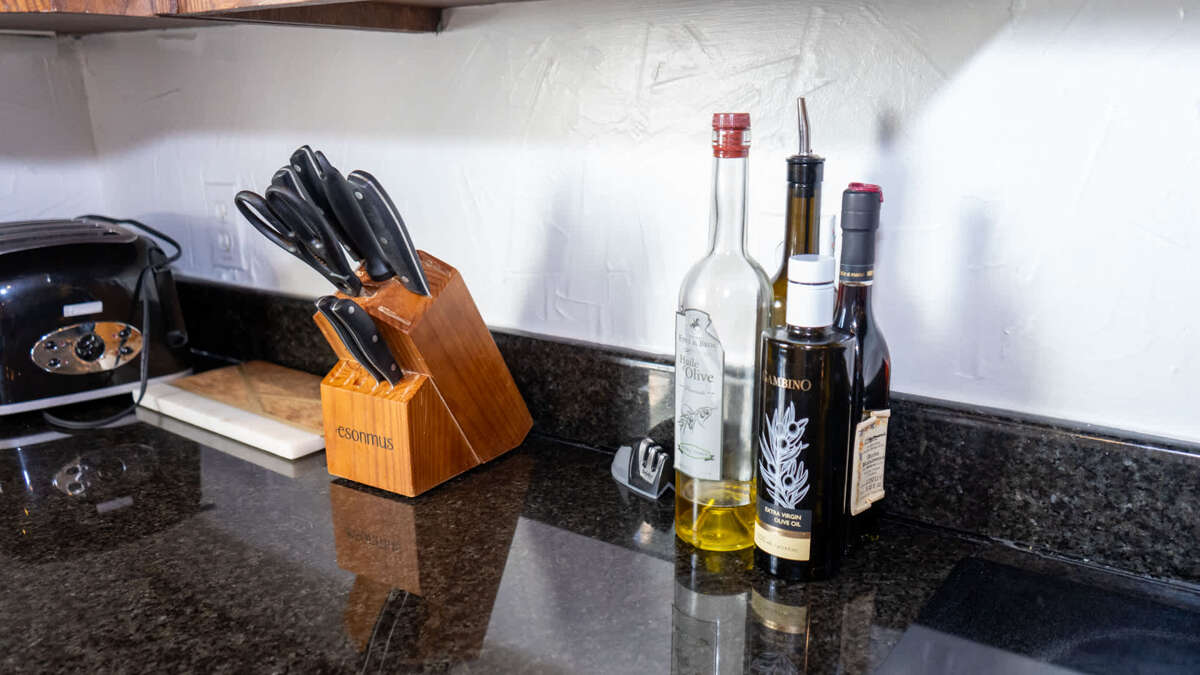 The fully equipped kitchen includes pots, pans, dishes, and cooking essentials for home-cooked meals. The open flow into the very large living room makes this level ideal for family movie nights or game nights (yes, board games are provided!)