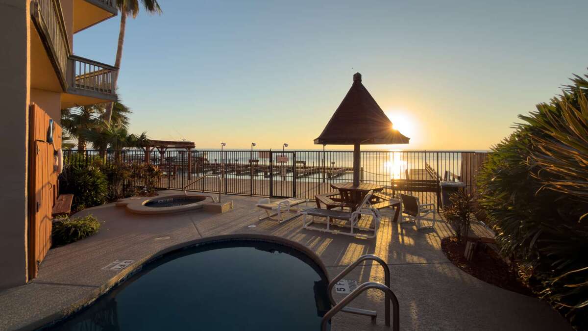 Bayfront apartment rental in South Padre Island with 2 bedrooms, 2 baths, and a private patio for sunsets, plus pool, heated jacuzzi, and boat docks.