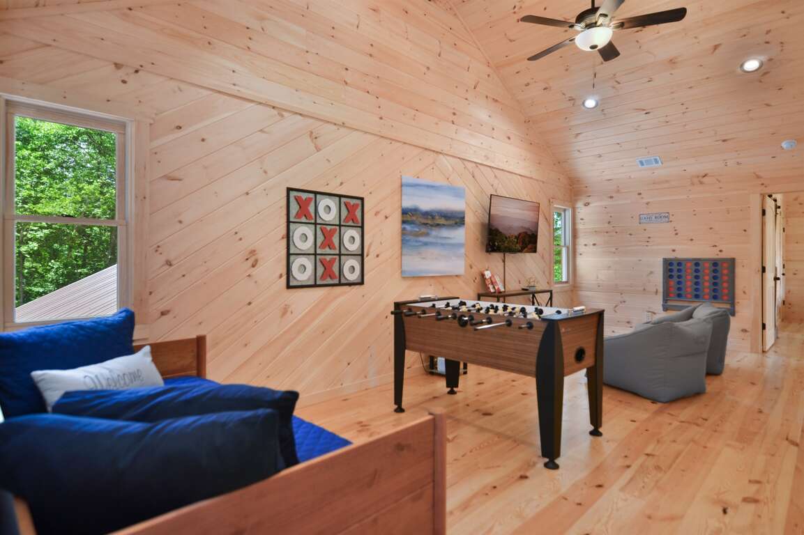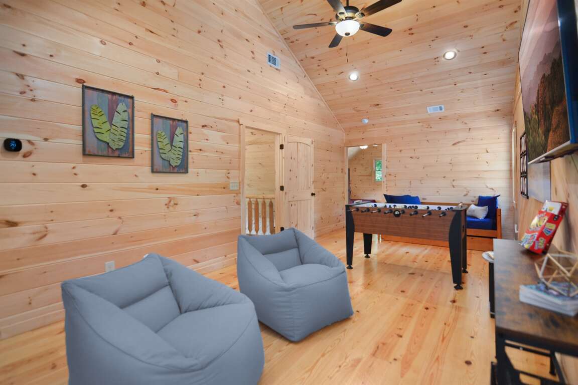With comfortable bedroom accommodations throughout the cabin and Led lights all over the entire house, this lavish retreat can sleep up to 11 guests, making it perfect for families or groups of friends. The spacious family room is furnished with plush leather couches, providing a cozy spot to relax while taking in the spectacular mountain vistas. Alternatively, retreat to the game room/loft area equipped with oversized connect four and tic-tac-toe boards, a foosball table, a magnetic chess board, comfortable bean bags for gaming, and a 55-inch smart tv for an immersive entertainment experience. Perfect for those who love to have fun and enjoy games with friends and family.