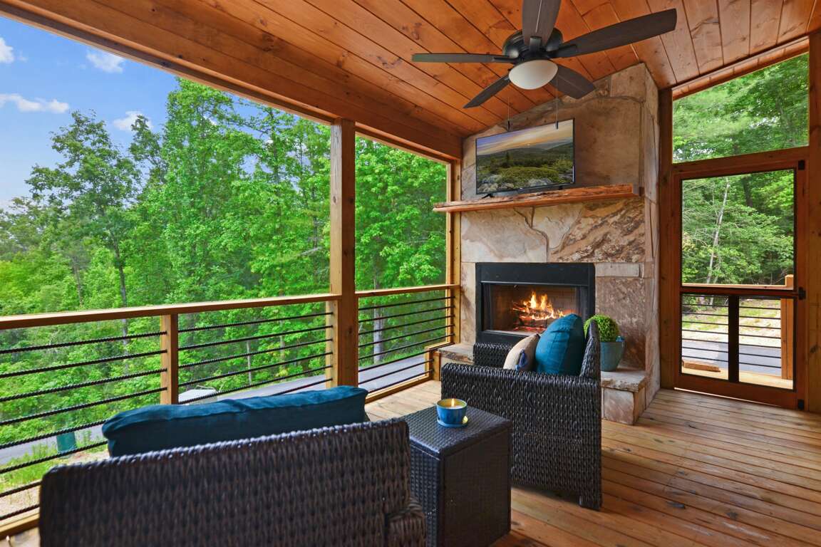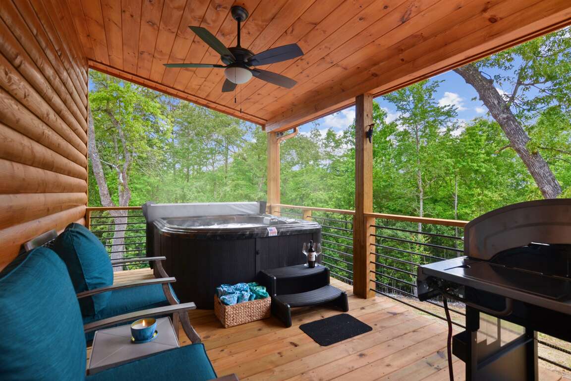covered decks, gas grill, main level multiple decks, freestanding gas fireplace w/ Smart TV, wicker patio chairs, deck, hot tub seats 6.