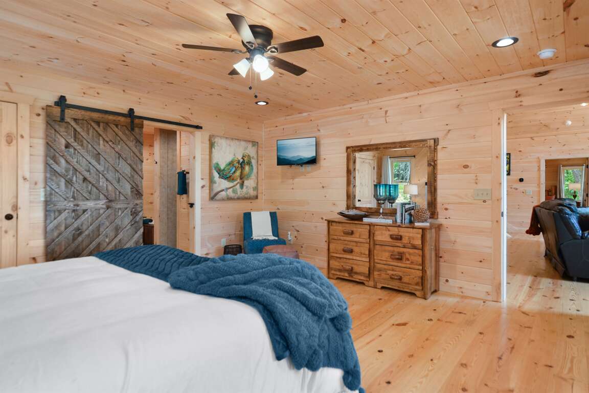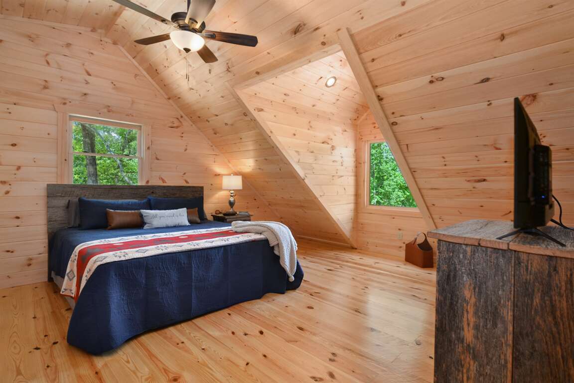 Bedrooms - two main level master bedrooms, king bed, Smart TV, dresser, nightstands, lamps, chair, ceiling fan, deck access; upstairs bedroom, King bed, Smart TV, dresser, nightstands, lamps, ceiling fan, rug; an upstairs second bedroom, King bed, Smart TV, dresser, nightstand, lamp, ceiling fan, rug, luggage racks; upstairs third bedroom 1 full & twin bunk bed, twin bed, dresser, nightstands, lamps, Smart TV, ceiling fan, rug; day bed and twin trundle in loft/game area