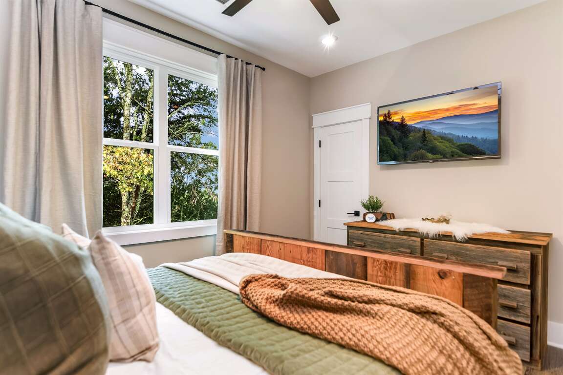 Upstairs, two inviting bedrooms share a full bathroom, offering the perfect setup for family or friends. Each space is cozy and welcoming, with windows that capture the same breathtaking mountain scenery.