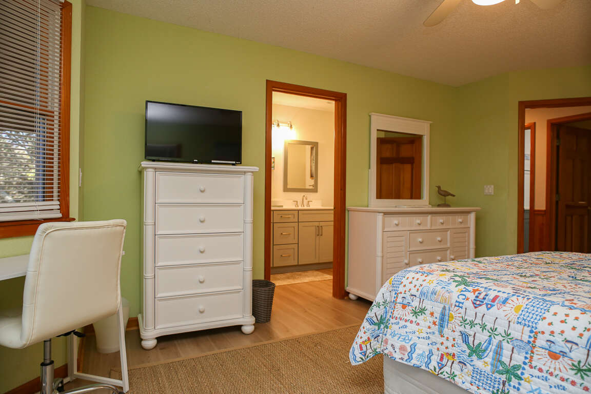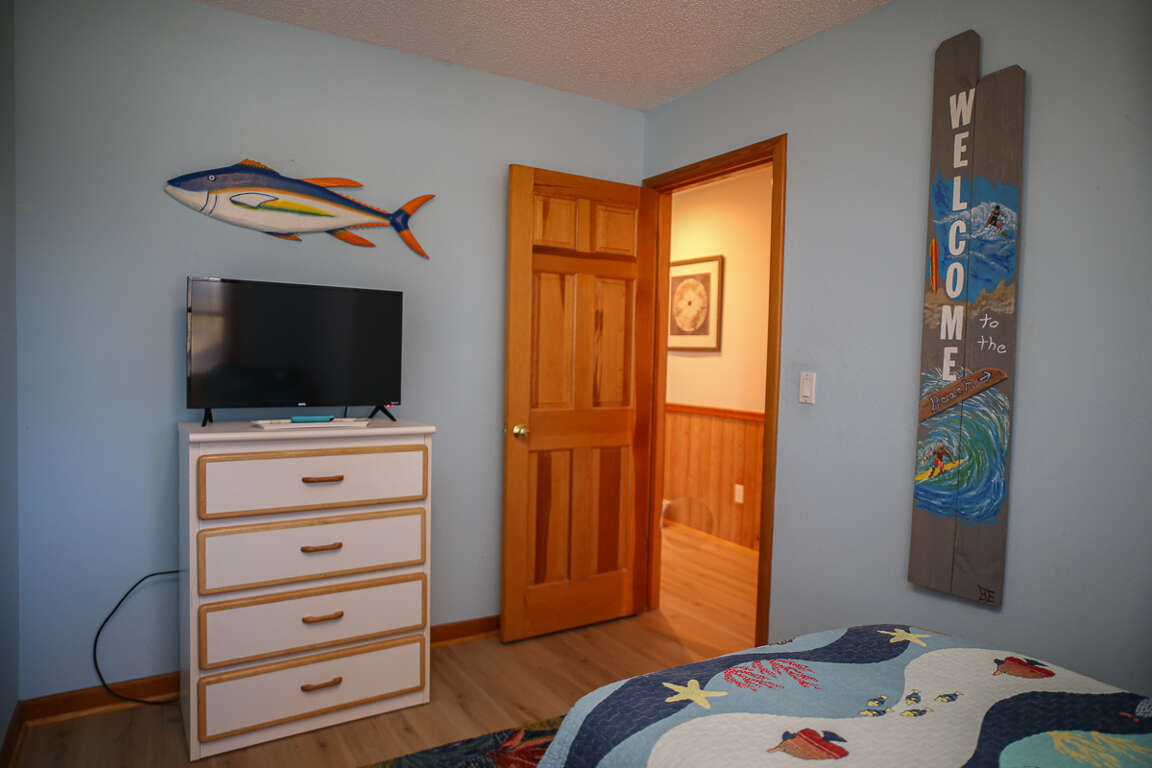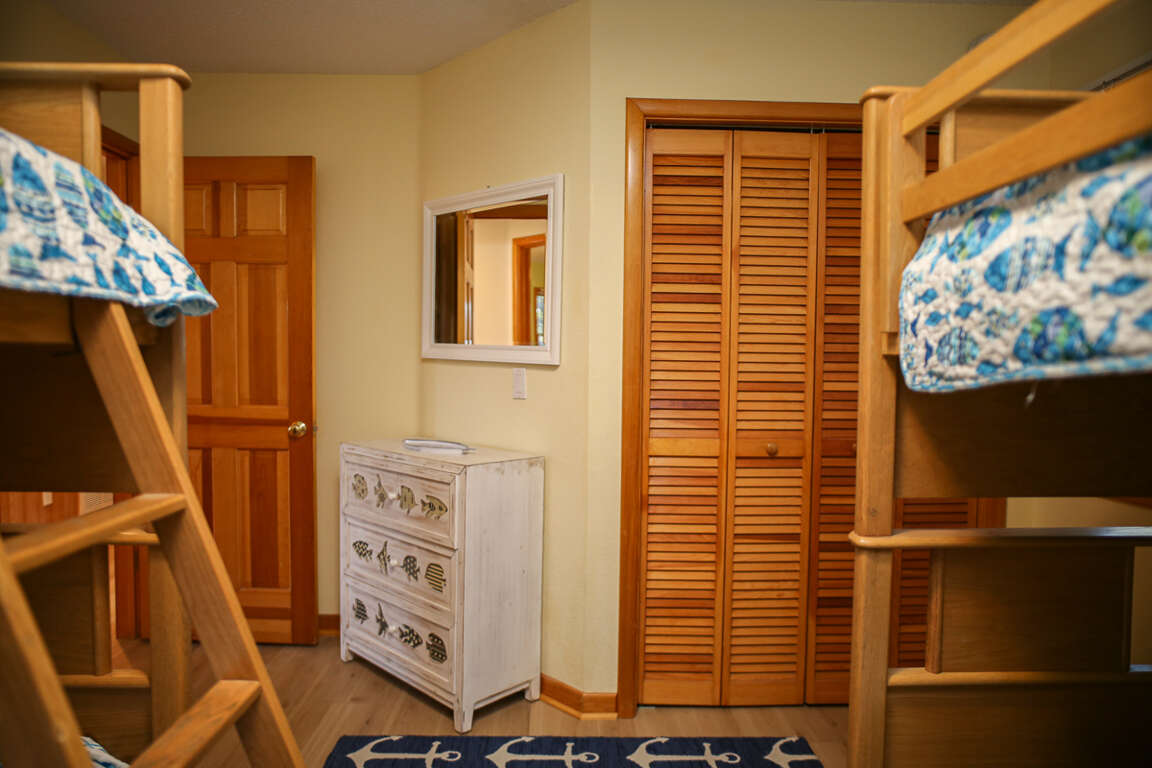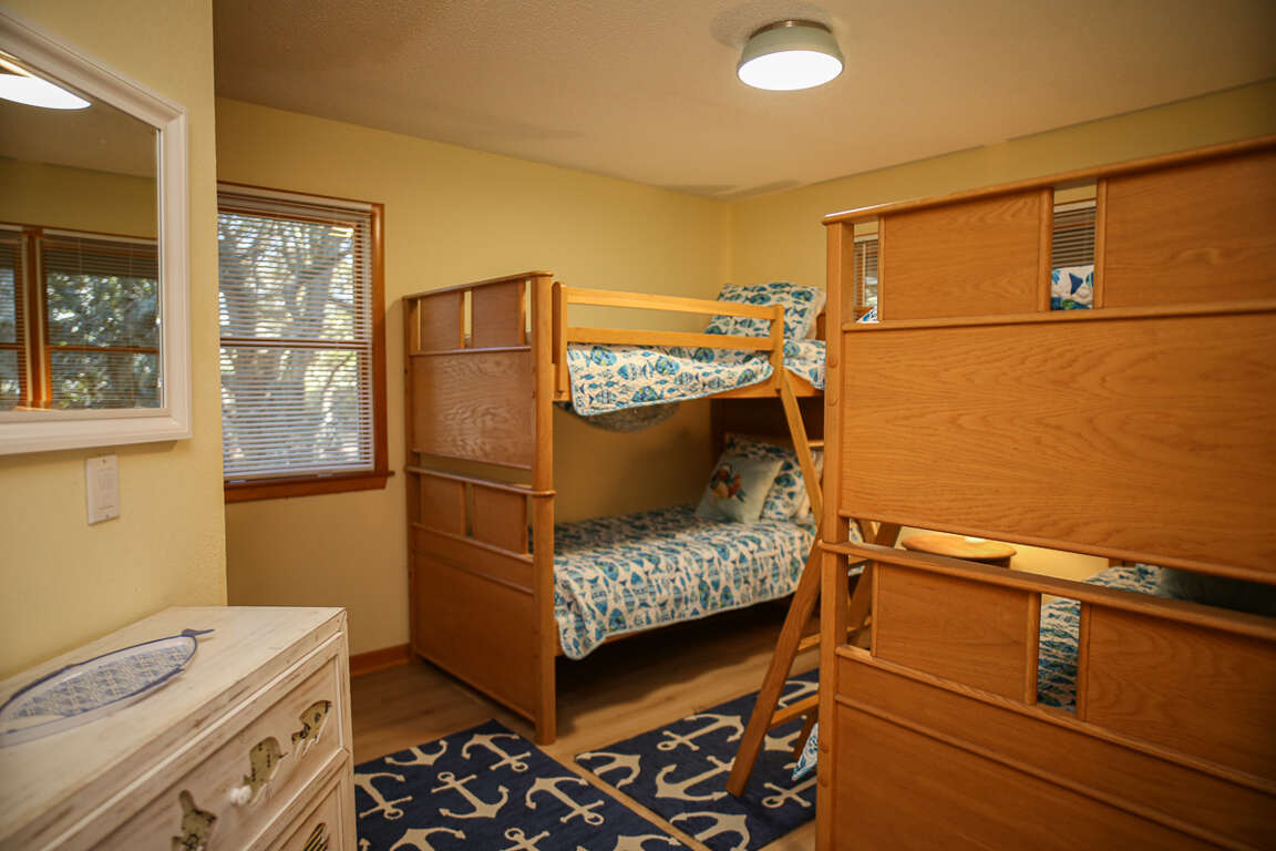 With five spacious bedrooms and a range of amenities, this coastal property provides a comfortable and inviting retreat for guests seeking a relaxing vacation experience. Each bedroom features tasteful decor, comfortable furnishings, and ample storage space, ensuring a restful stay for all guests. The master bedroom boasts a double bed, deck access, and a luxurious Jacuzzi tub, perfect for unwinding after a day of outdoor activities. Another room offers two bunk sets, ideal for accommodating younger guests. Additionally, the semi-private master bedroom on the third level provides a serene escape, complete with a king bed, full bathroom with a Jacuzzi tub, and double sinks. Guests can also enjoy easy access to the pool and rest assured with meticulous pool maintenance. Whether seeking rest or recreation, the bedrooms at Sweet Carolina cater to every guest's needs.
