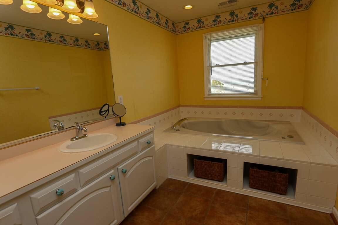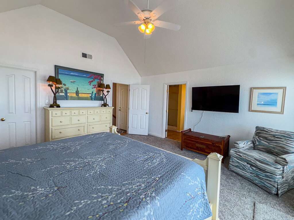 <p>3 bedrooms (1 with King, Smart flatscreen television with ocean facing sun deck access and private bath with spacious sink vanity, jet tub and a separate walk-in shower; 1 with King and Smart flatscreen television; 1 with Twins and Smart flatscreen television); full hall bath with tub and shower); laundry closet.</p>