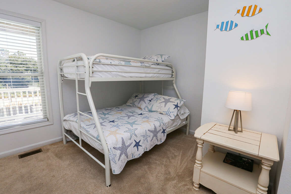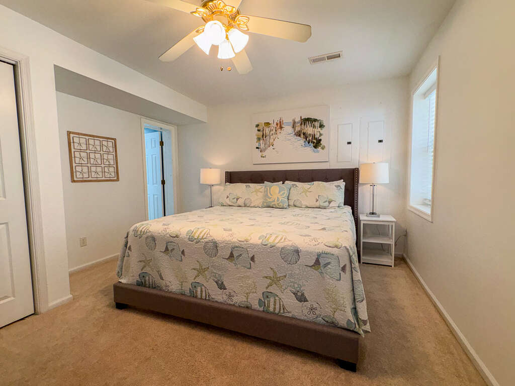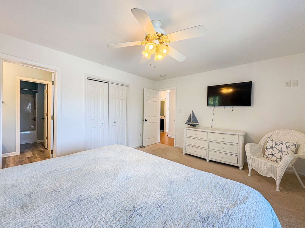<p>4 Bedrooms (1 with King, access to deck, private bath w/tub & shower; 1 with King and television; 2 with Pyramid bunk and television); hall bath (w/tub & shower)</p>