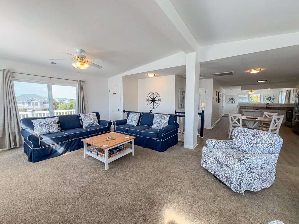 <p>Create lasting memories with the entire family at Dolphin Dunes, a spacious seven-bedroom oceanside retreat in Duck. Just a short stroll from the shoreline, this home blends comfort with convenience, offering both indoor and outdoor features designed for relaxation. The top-level living area boasts vaulted ceilings and two cozy seating spaces, while the open floor plan keeps the kitchen connected to the conversation. Cooks will love the granite countertops and stainless steel appliances, making meal preparation a breeze.</p>
