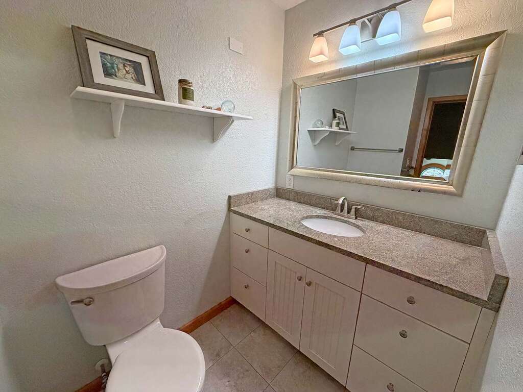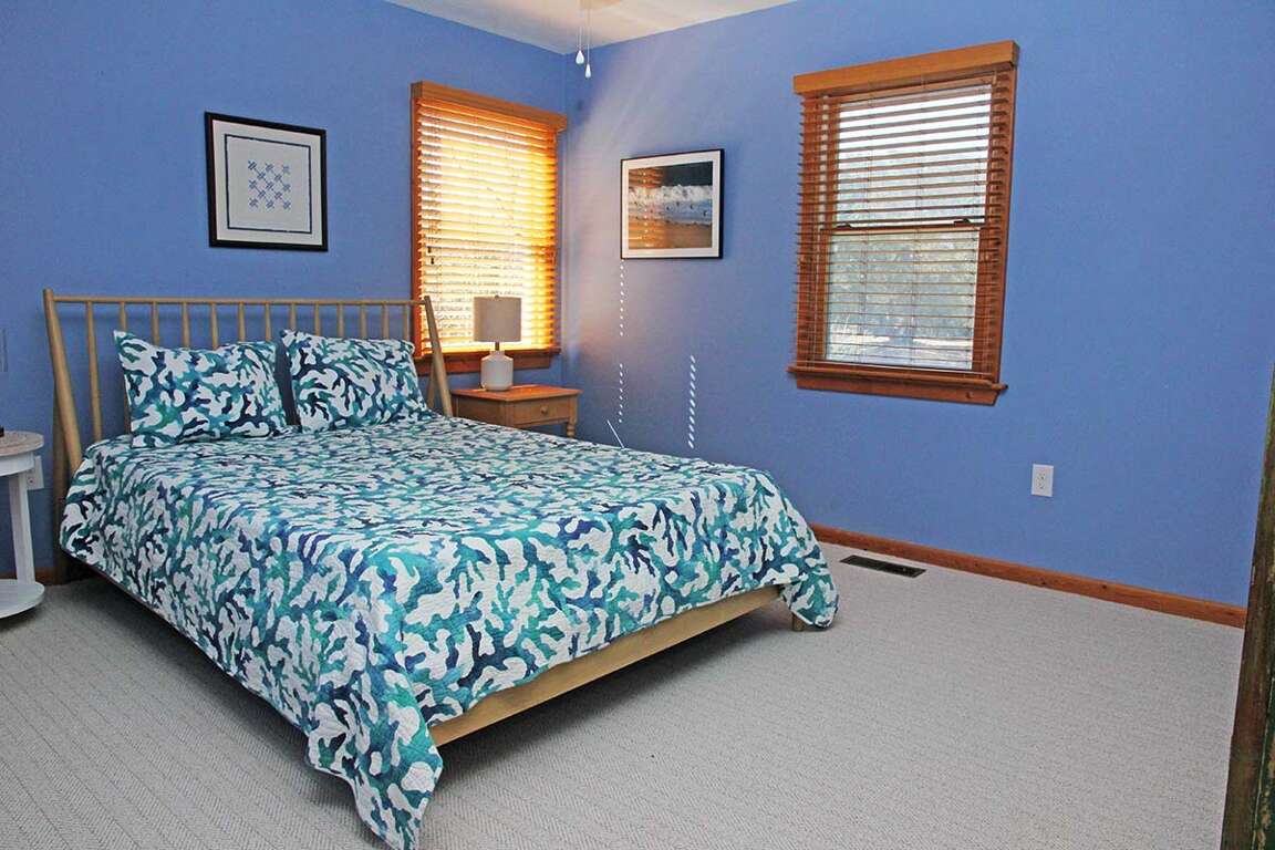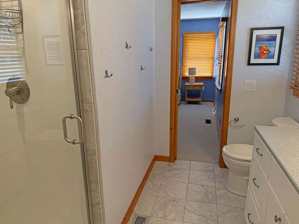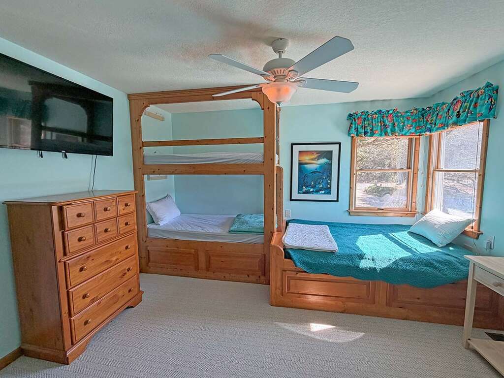 <p>4 Bedrooms (1 with custom built Twin bunk and Double bed combo) with TV; 1 with a Queen bed shares a Jack-n-Jill bathroom with shower with 1 with a King bed, TV and deck access; 1 with 2 Double beds and deck access). Full hall bath (with tub and shower). Laundry is on the landing between level two and three.</p>