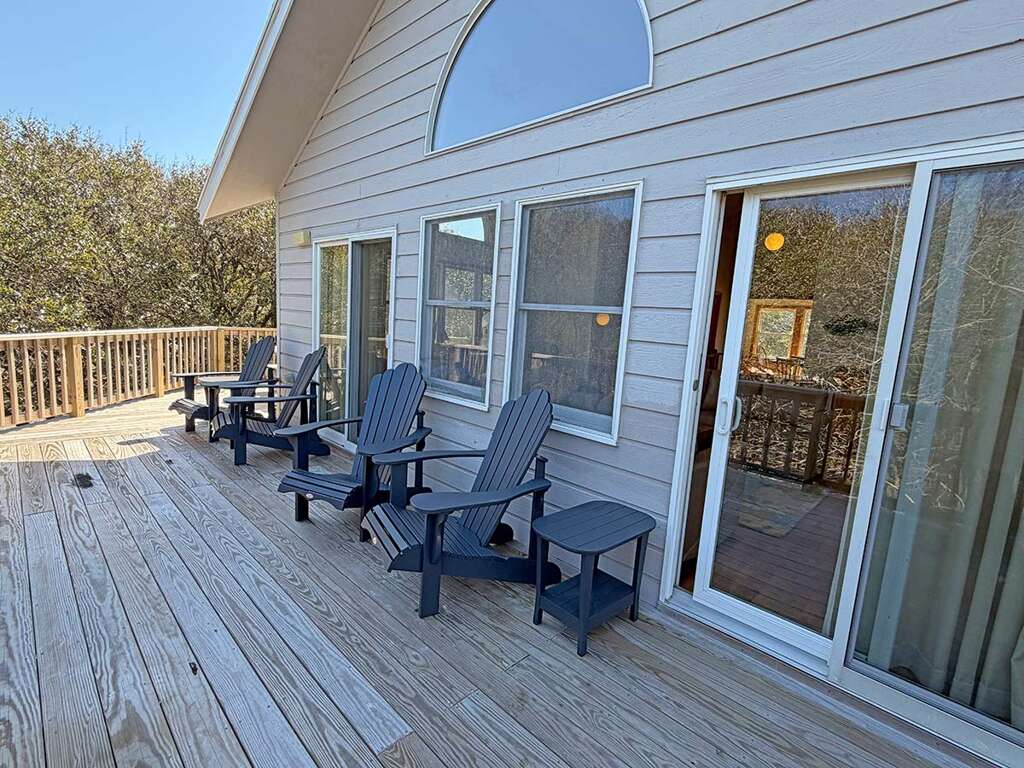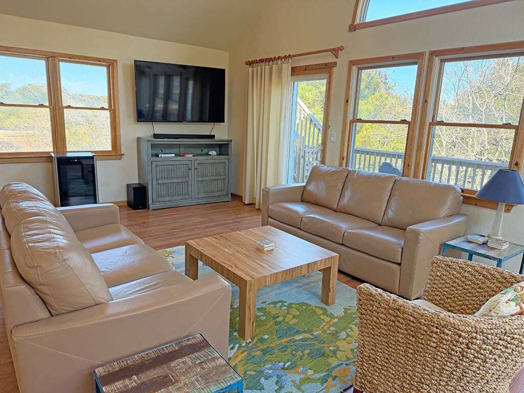 <p>The top floor includes a bright dining room which seats 8 people, beautifully appointed kitchen with a pass-thru and bar, and an open and airy living room with deck access. Windows abound on every wall, allowing the wonderful OBX sunshine to naturally light the beauty of this well cared for home. There is also a half bath on this floor for guest convenience.</p>